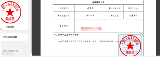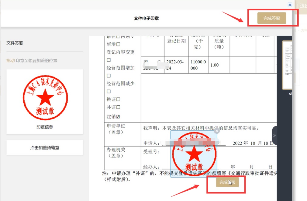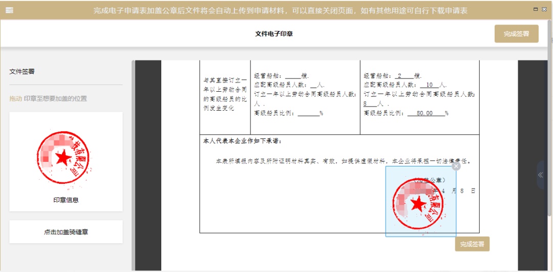 ②电子签章页面左侧为法人一证通所带的电子签章,申请人确认申请内容后,使用鼠标将左侧的电子签章拖放到右侧经营人公章位置,然后点击“完成签署”按钮。