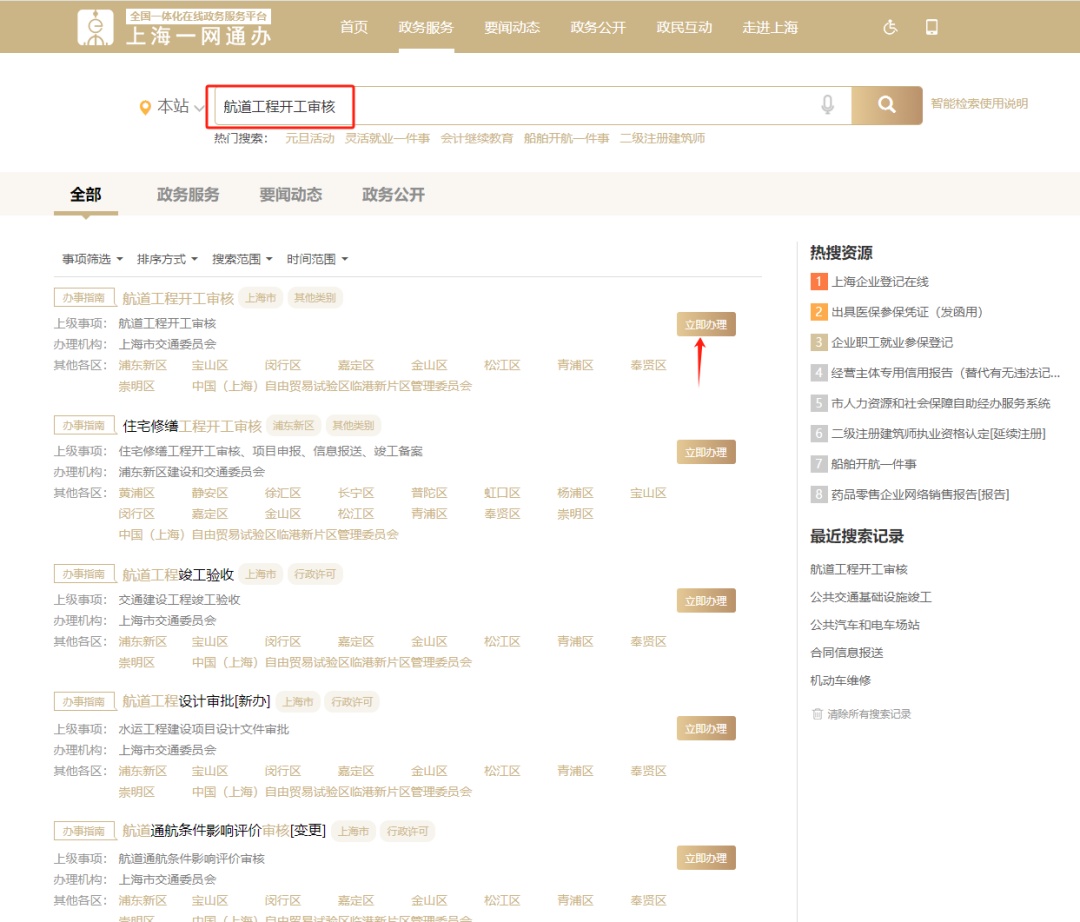 在服务搜索栏输入“航道工程开工审核”,搜索到要办理的事项名称,点击“立即办理”,进入申请页面。
