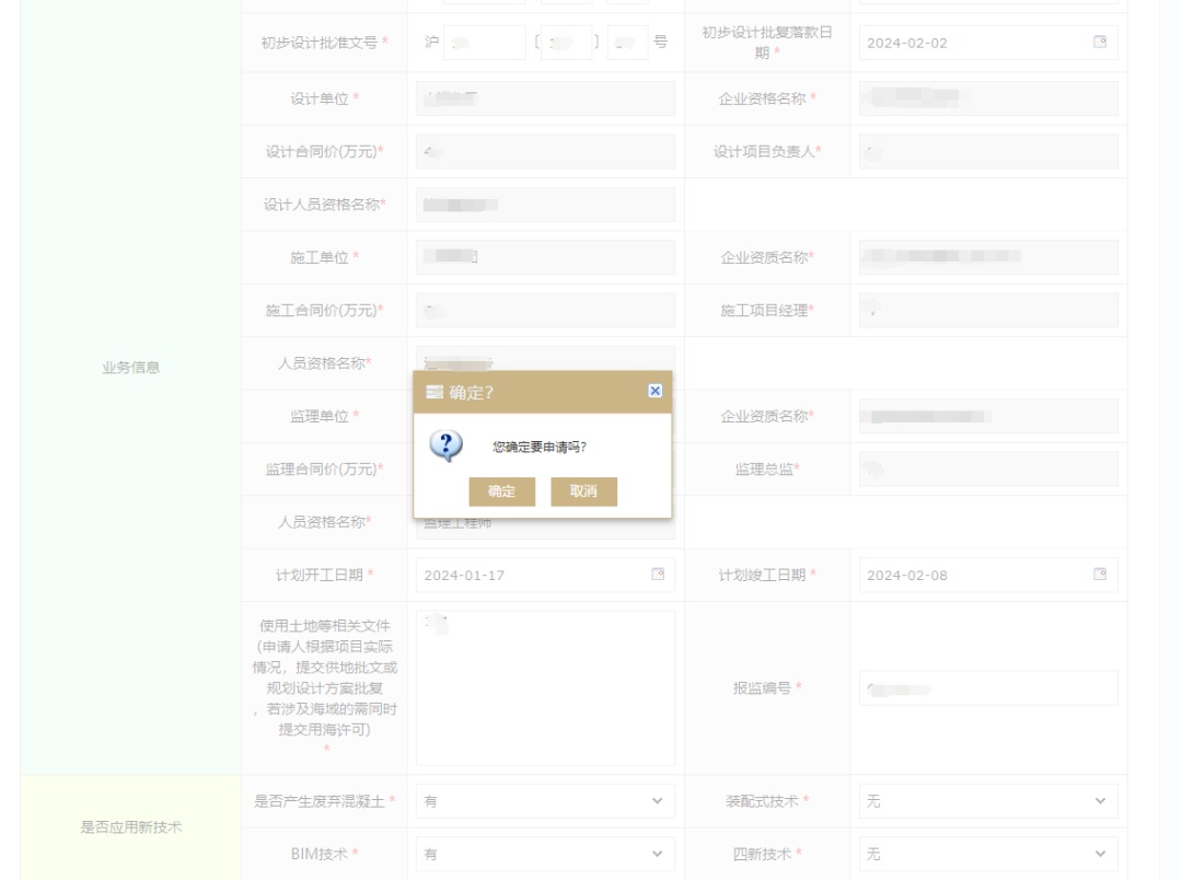 (4)材料上传完成后,点击下方的“申请”按钮,在随后弹出的确认弹窗中点击“确定”按钮,确定本次申请内容。