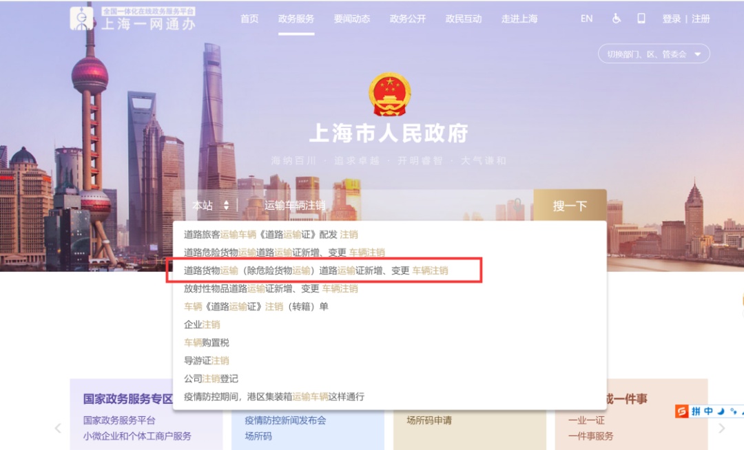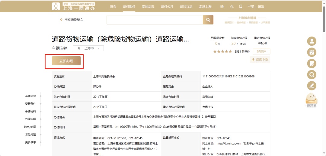 服务搜索栏输入“运输车辆注销”,搜索到要办理的事项名称,点击“立即办理”,进入申请页面。