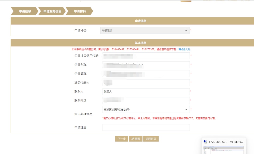 (1)进入业户信息填写页面,依次填写相关内容,点击“下一步”进入申请信息页面。
