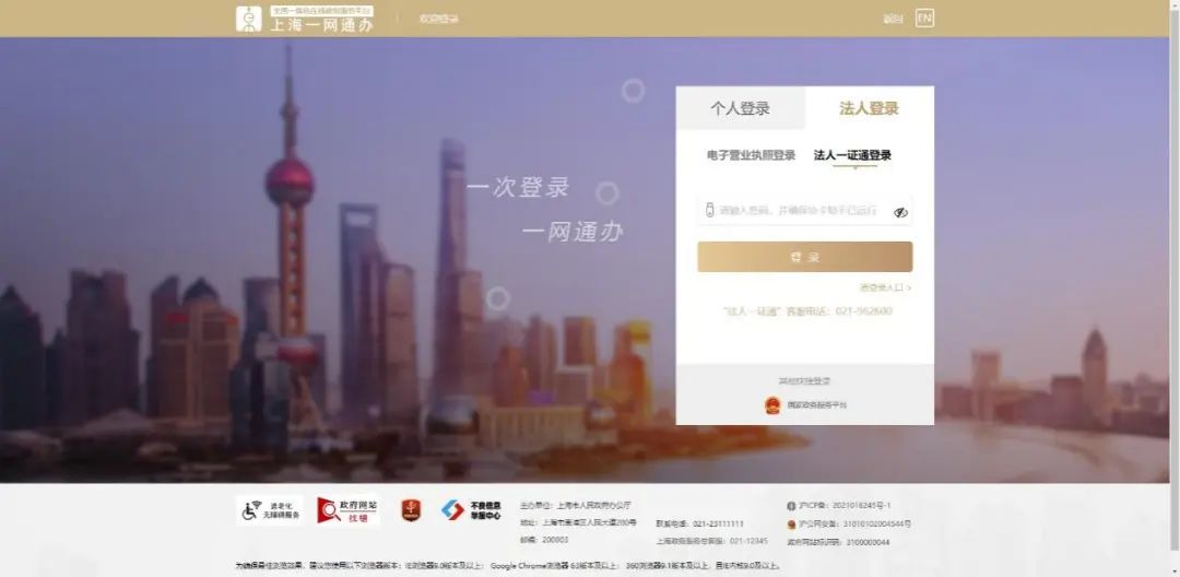 在浏览器地址栏输入https://zwdt.sh.gov.cn/govPortals/index.do网址,插入法人一证通后,输入一证通密码进行登录。