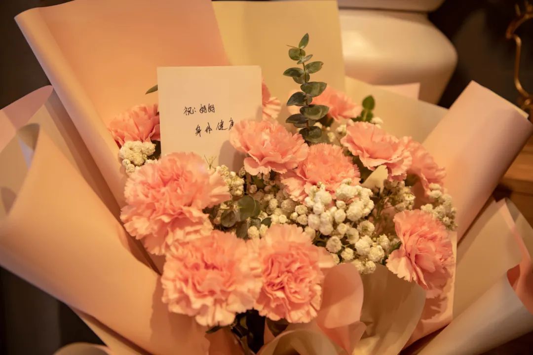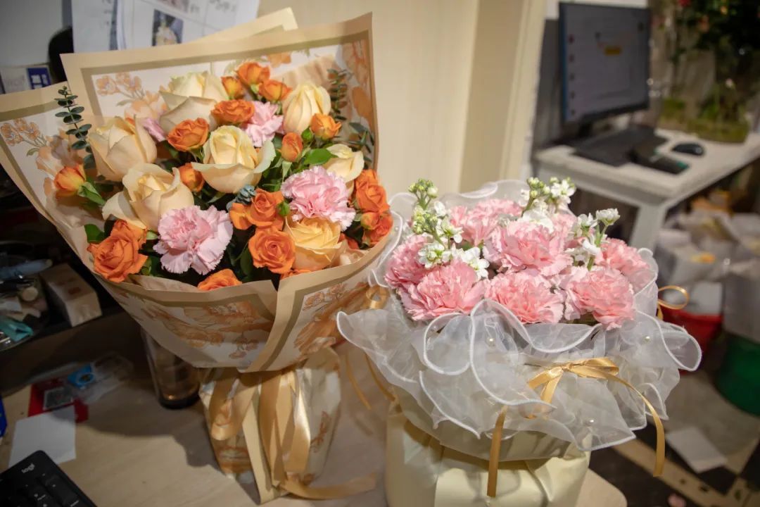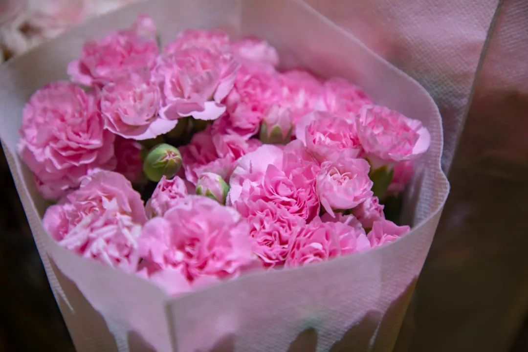 康乃馨一直以来都是母亲节的热销花,寓意着母爱的纯洁和温馨,店内也已早早准备了各种样式的康乃馨花束。