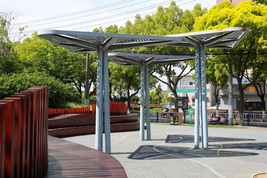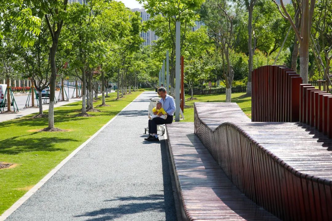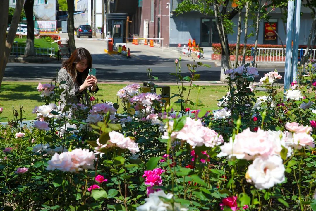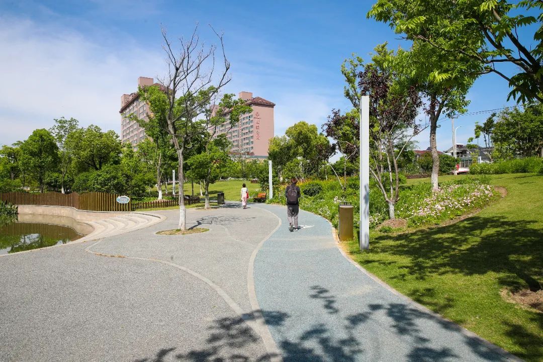 走进公园内,只见各色月季花正值盛花期,吸引了来往的游客驻足欣赏与拍照。秀浜河区域设计了亲水台阶和观景平台,层叠式浅台阶设计延续着水纹的蜿蜒秀美,同样的曲线设计也运用在沿河栅栏处,居民既可走近平缓水域,也能在河岸闲庭信步。