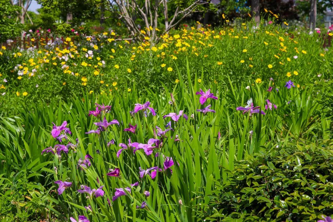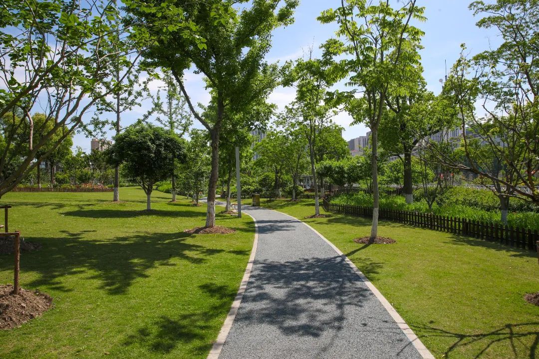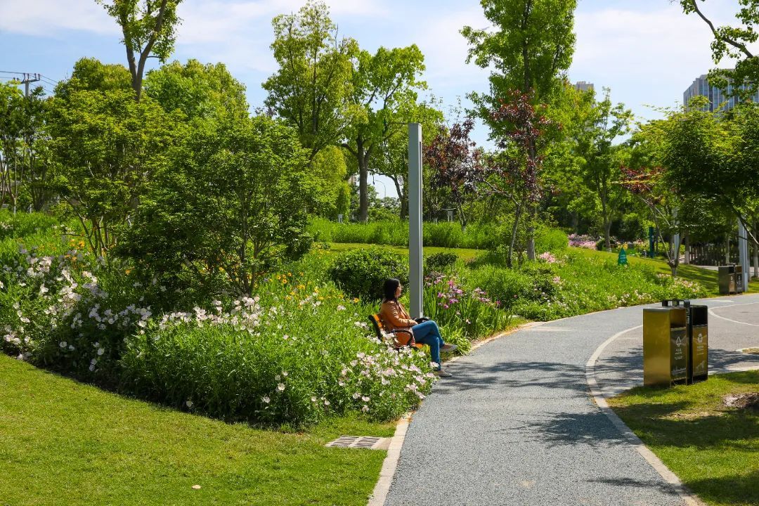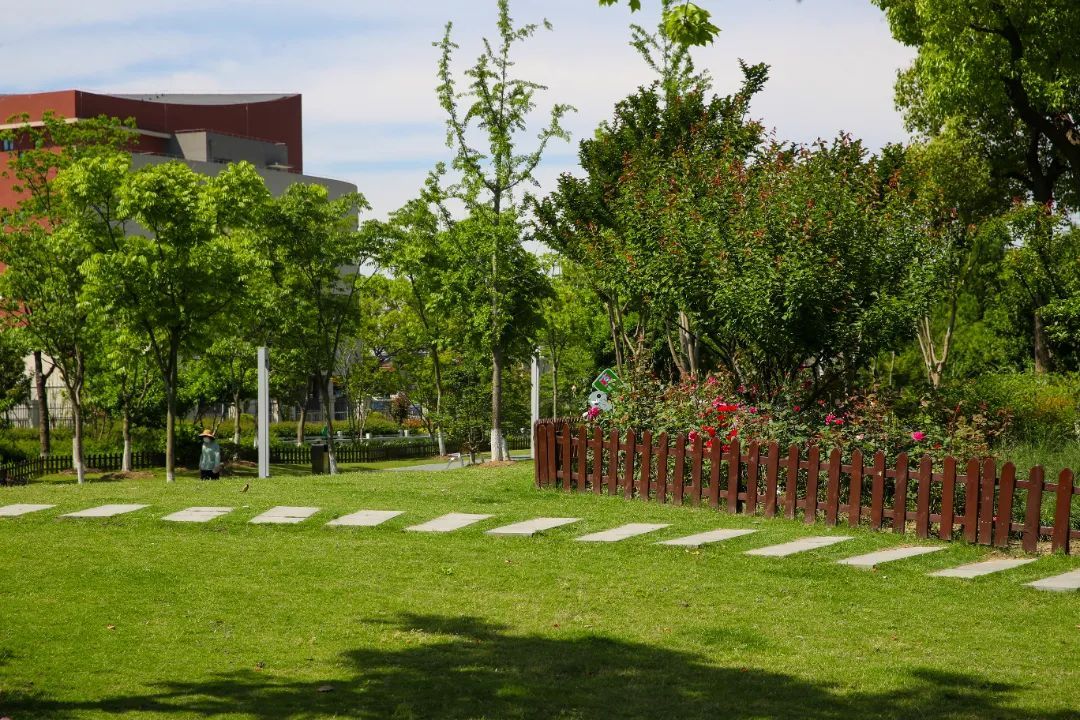 与水为邻,花园的丰富植被从挺拔的乔木到脚边的地被植物一应俱全,榉树、银杏、榔榆、染井吉野樱、湖北海棠、鸢尾花、琼花、美人梅、紫薇等40余个品种让这一开放型休闲绿地全年拥有不同的美丽风景。