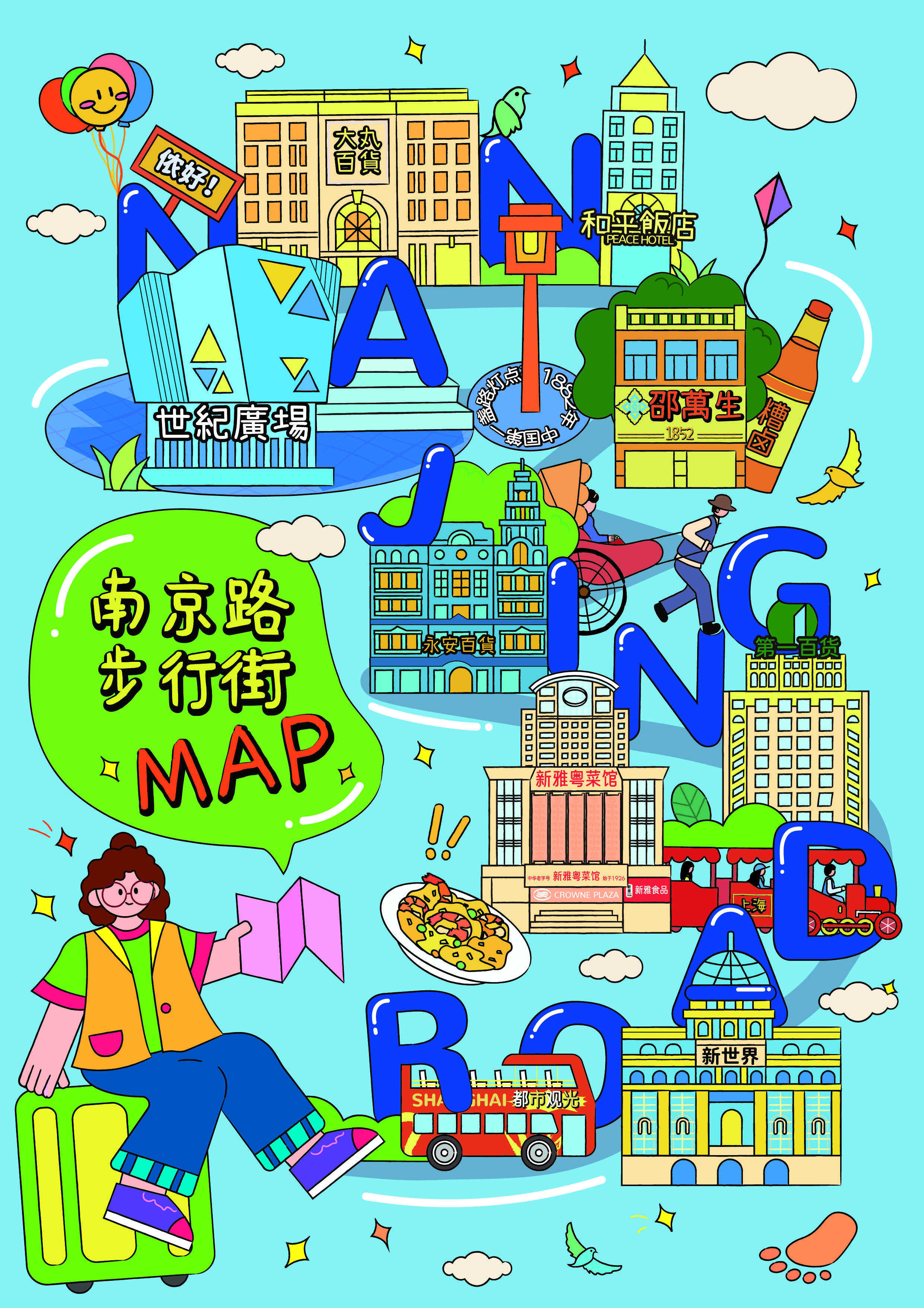 这张手绘地图,仿佛一把神奇的钥匙,打开了南京路奇幻之旅的大门。波普插画风格独特而鲜明,使得每一座沉淀历史韵味的建筑、每一个标志性的打卡点都栩栩如生,跃然纸上。