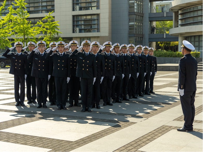“一!二!三!四!”整齐跑步而来的是身穿海员服的航海学子,他们步伐整齐划一,口号响亮有力,精神状态饱满。“稍息!”“立正!”在指挥员激昂的口令声中,学子们动作流畅,依次完成了一系列精准的队列动作——立正、跨立、稍息,还有那停止间转法、蹲下起立、脱帽戴帽、敬礼礼毕,每个动作都如行云流水,这正是他们强烈的集体荣誉感和卓越精神风貌的最佳展示。