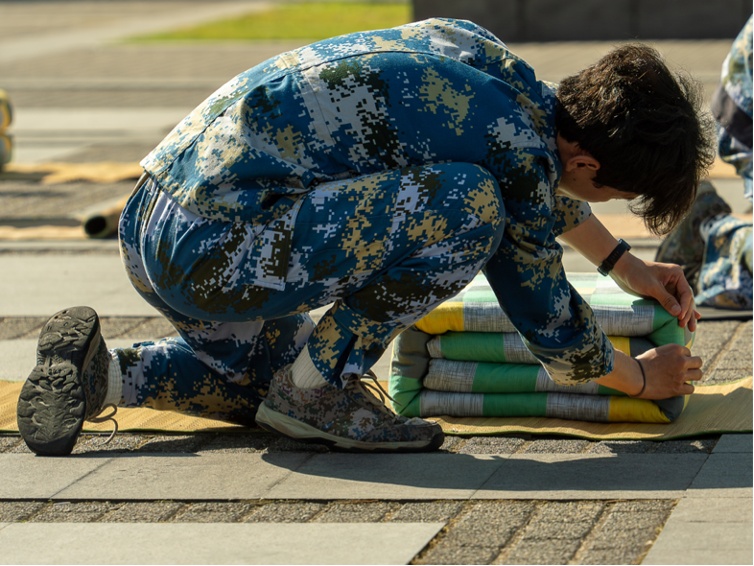 随着指挥员的一声“开始”,同学们抱着被子跑步进入航海广场中心。这是上海海事大学特有的准军事化管理成果展示。要在五分钟内把一床软绵绵的被子叠成豆腐块状,是一项不小的挑战。只见同学们动作娴熟,铺平、压实、翻折、抠角、捏线,每一个步骤都一丝不苟,很快一个个有棱有角的“艺术品”就完成了。