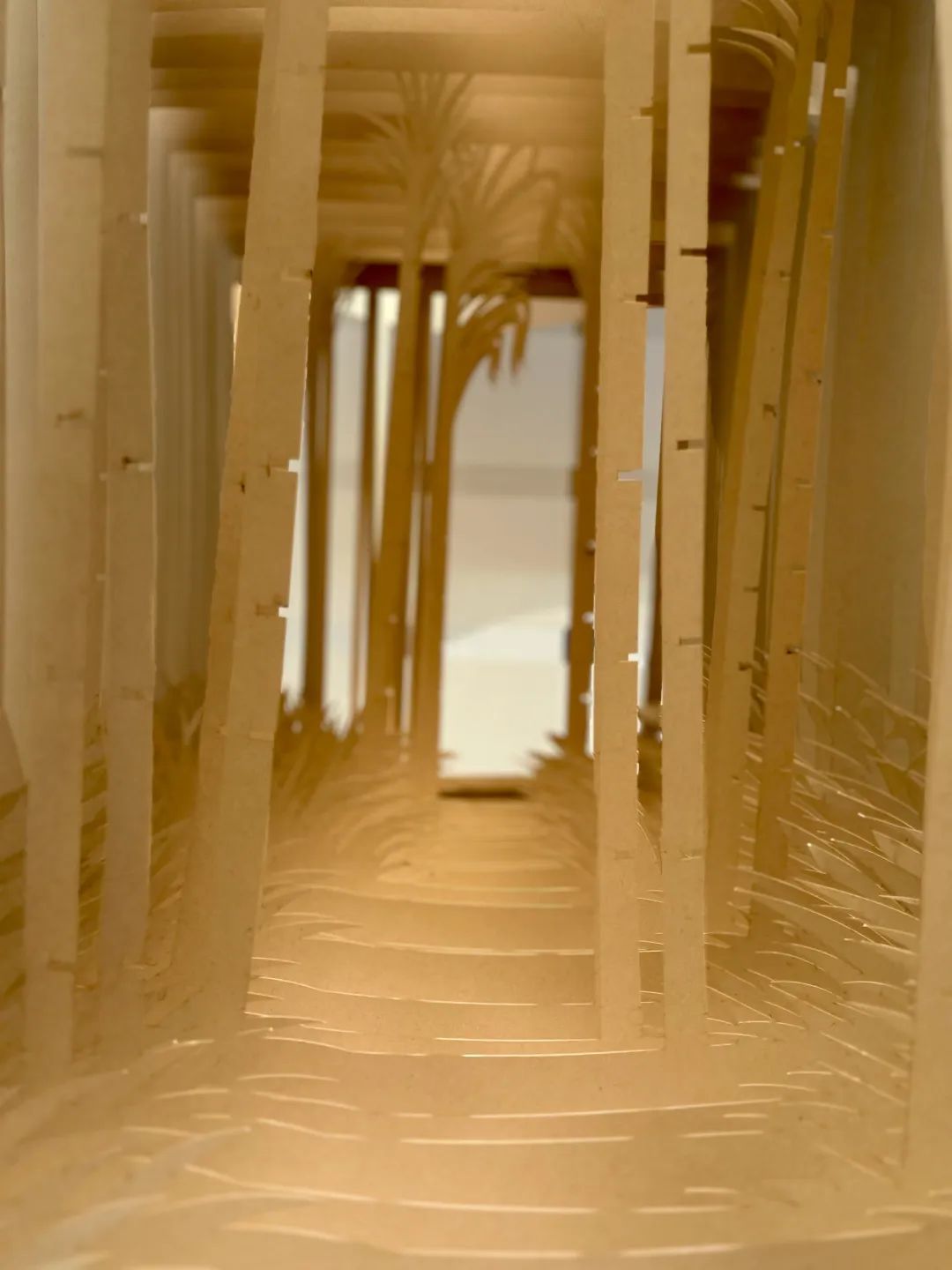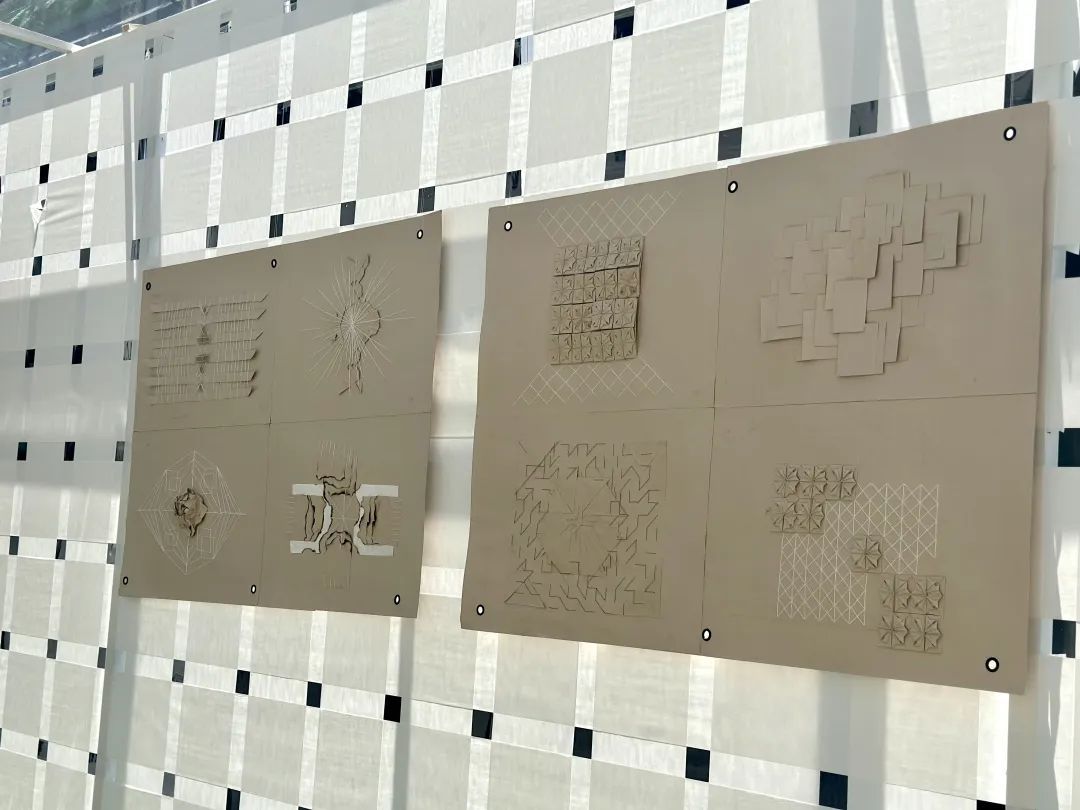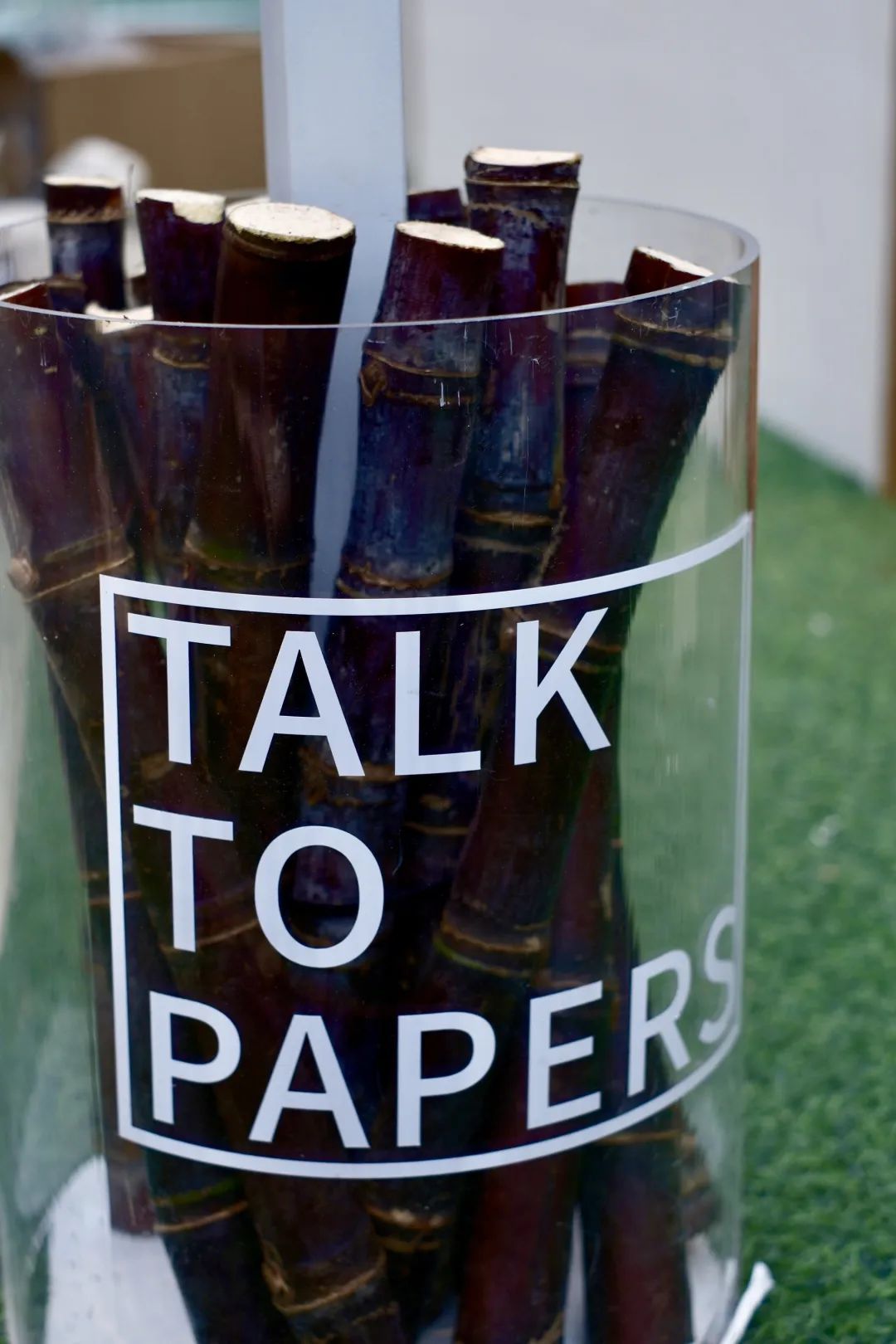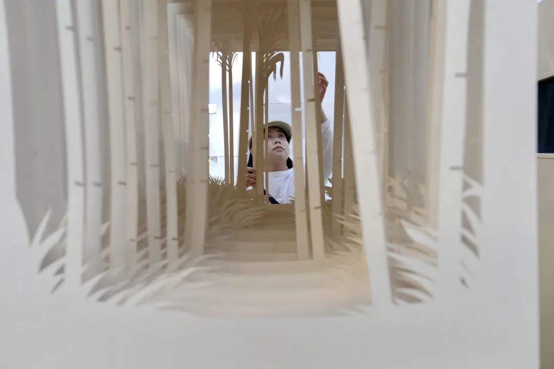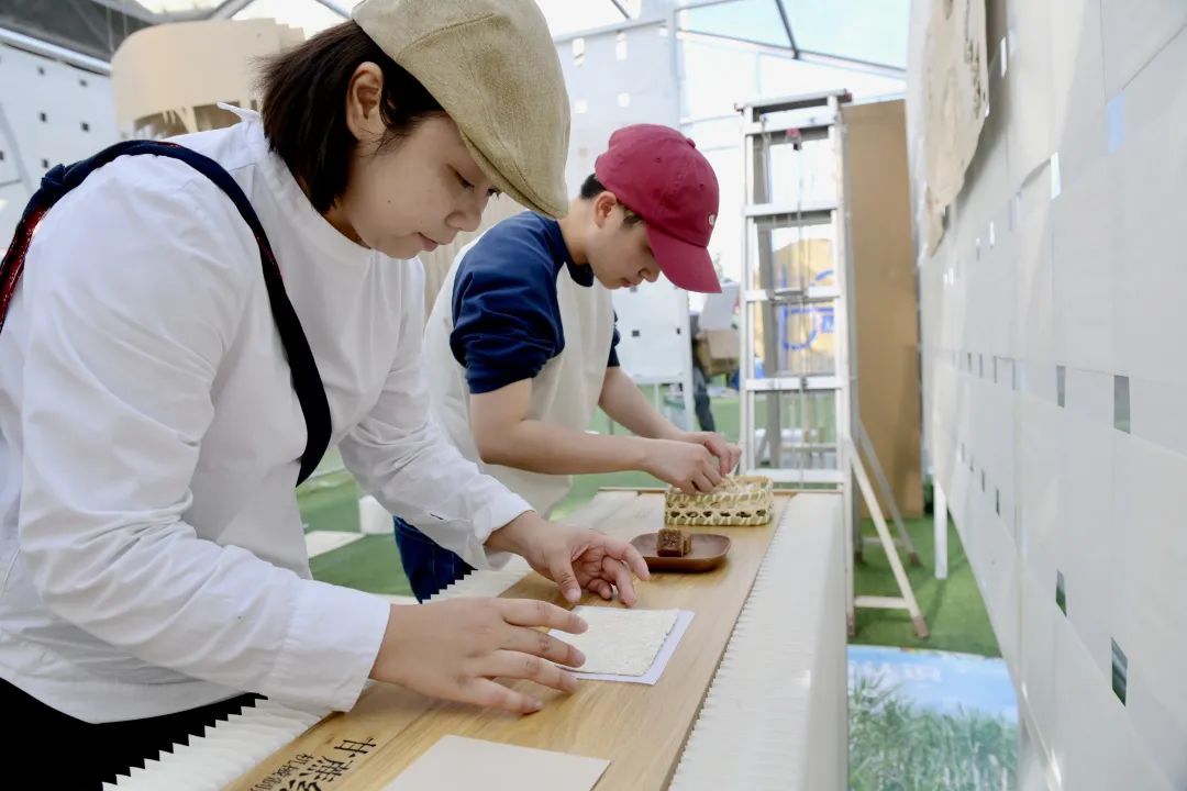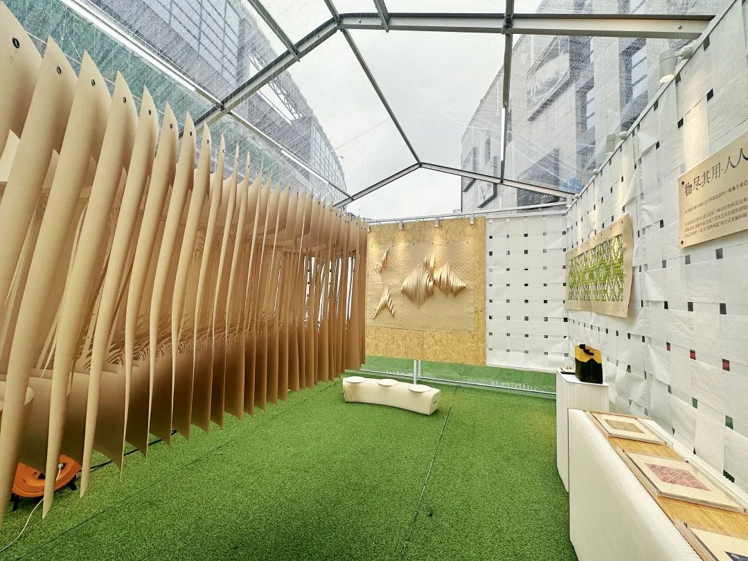眼下来到大宁音乐广场北广场,市民均会被一方别具匠心的空间所吸引。空间内,数张略显粗犷却盈满生命力的甘蔗纸张随风呈现出多样的姿态:或轻盈飘散,或有序排列,或巧妙折叠,展现出源自广西山野间,流淌自然文脉的生命律动。