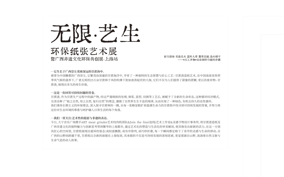 在被誉为“中国糖都”广西崇左市,广袤无垠的25万亩甘蔗林不仅为大家提供甜蜜的蔗糖,其生产过程中的副产物甘蔗渣还展现出非凡的再生价值,并孕育出了一种独特匠心工艺——甘蔗渣造纸艺术,“这种循环经济模式,完美诠释了‘取之自然,用之自然,复归自然’的理念,遵循了自然界生生不息的规律,实现了一种绿色、有机且持久的良性循环……而这也是我们本次‘无限·艺生’展览的核心理念。”本次展览上海站执行策展人景云表示。