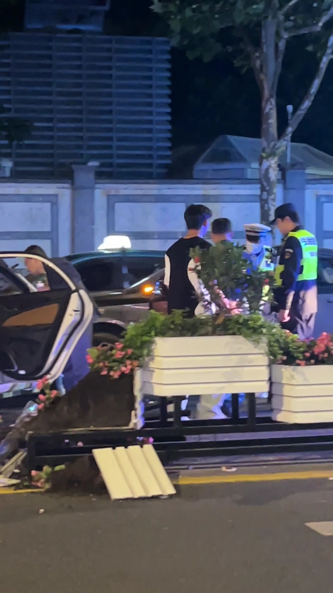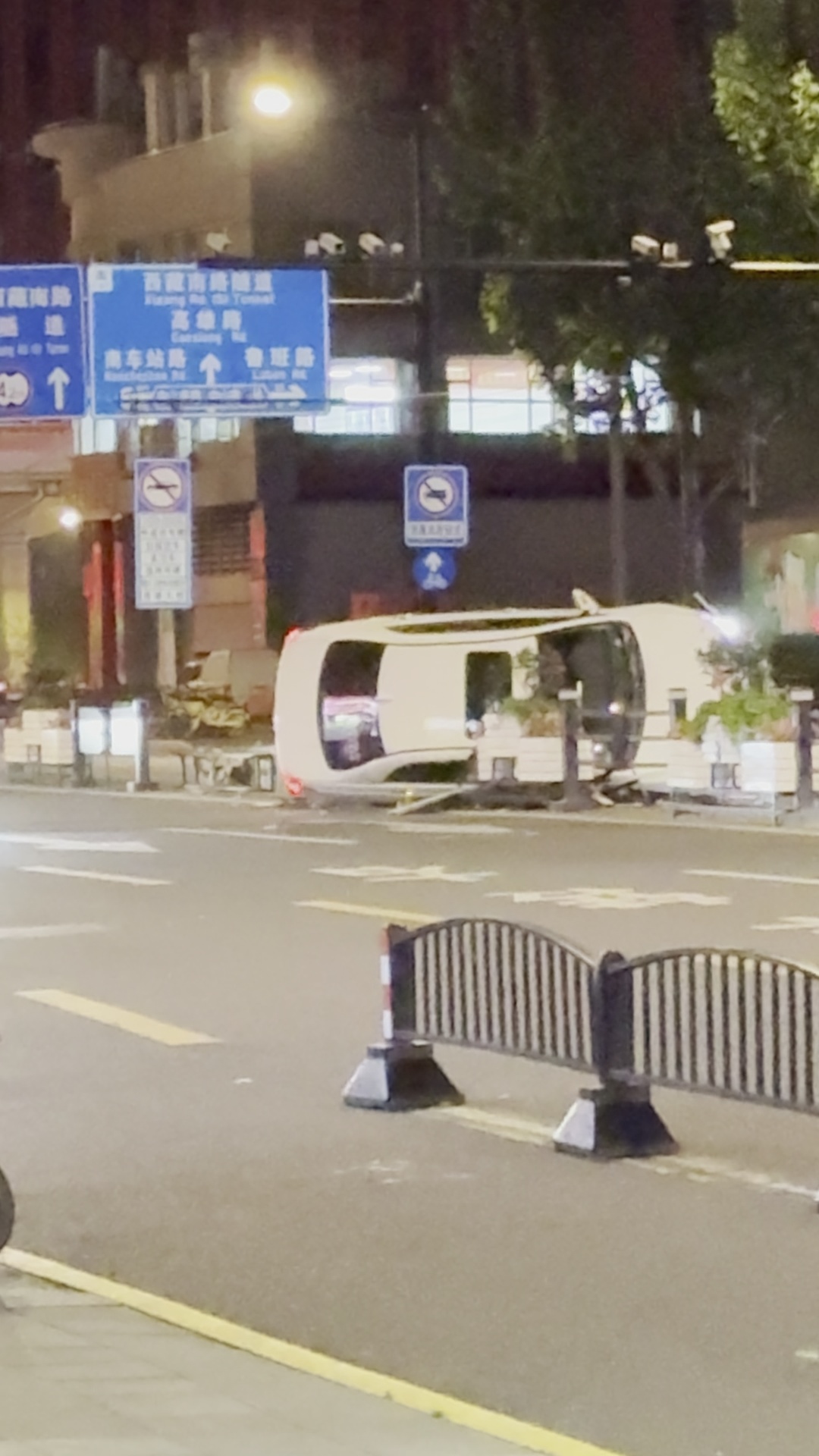记者找到了鲍佳富,对于昨晚的事故,他记忆犹新。昨天因为排练到很晚,结束后他和同行的伙伴吃完饭,正在马路边上休息,一声巨响传来,就看到一辆白色轿车撞到隔离栏后当场侧翻了。
