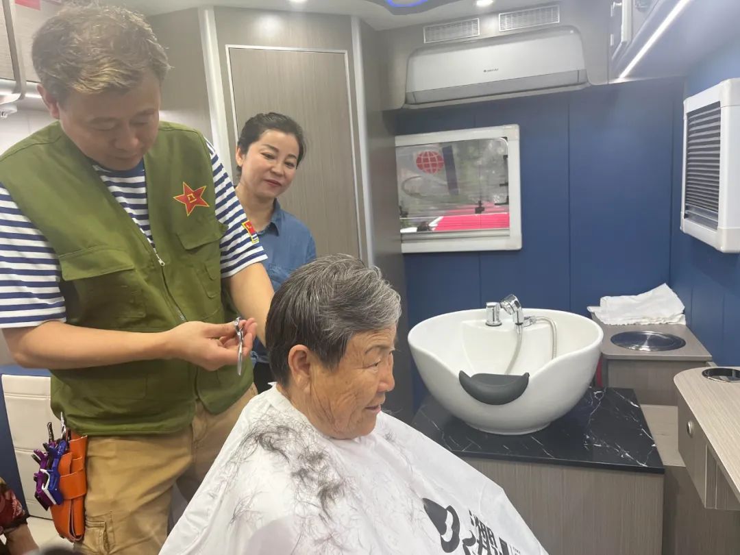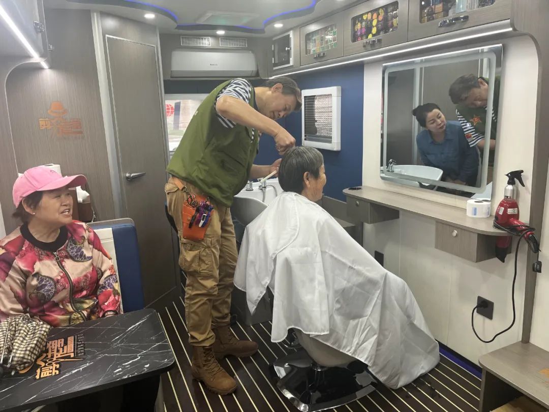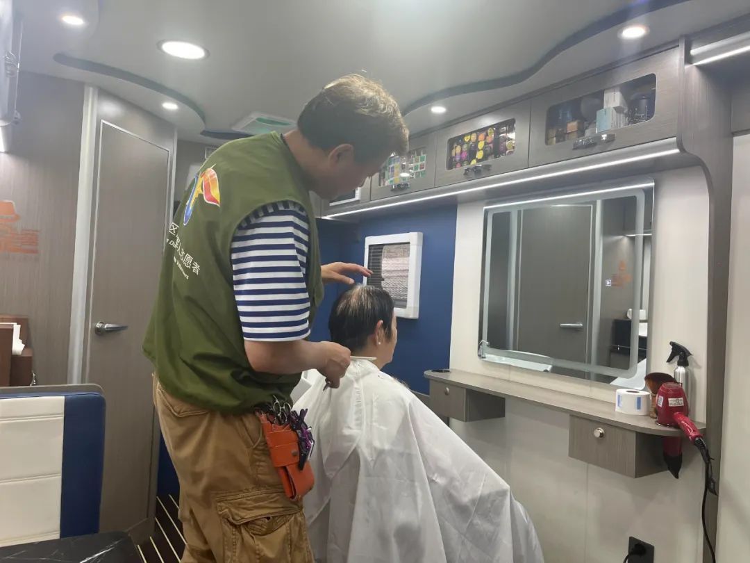 属于母亲节的上周末,奉贤西渡街道文怡社区的民居惊奇地发现,小区广场上多了一辆房车,房车的里面竟然是个理发工作室,阿姨妈妈们在家门口就能变美丽了。 上午10点,一辆房车改造的移动理发车开到了文怡花园的小广场,小区居民立刻好奇地张望,居民李阿姨成了第一个“吃螃蟹的”人,她兴冲冲地在车里张望,小小的空间内,洗发盆、半身镜、吹风机、热水、空调、剪发工具等一应俱全,理发师张师傅笑盈盈等待着大家,开启“随叫随到”理发服务。在听完李阿姨的要求后,张师傅先是干脆利落地剪掉每一茬横斜出来的头发,边剪边询问是否合适。短短15分钟,李阿姨就换了一个整齐清爽的新发型。而在房车外,阿姨们坐在雨棚下,拿着志愿者赠送的鲜花,笑容满面地拉家常,坐着轻松排队。 “这些都是我自己画图,然后标尺寸发给厂家。厂家再根据他们的车身尺寸为我量身定制而成的。”退役军人理发师张爱梅从事理发行业30多年,他说,“我把理发店所有的功能都在车上体现出来,洗头、烫发、染发都可以,还有卫生间,都是为了可以方便大家!” 除了贴心的房车理发服务,居委会和老兵服务社一起为居民提供了实惠的集市服务。虽然天气变化多端,时不时下雨,但居民们热情不减,撑着伞,在各个摊位上兜兜转转,寻觅心仪的货物,买点小菜,选点零食。志愿者们还贴心提供了鲜花,赠送给小区的妈妈们,让大家喜出望外。 文怡社区老兵服务社创始人薛福林介绍道:“我们已经是第二次来文怡社区活动了,之后我们每个月基本上会来一到两次。如果居民有需要,还会增加。我们会陆续挑选一些适合我们社区的公益活动,比如惠民洗衣等家政类服务。” 据了解,“老兵服务社”由文怡社区退役军人发起成立,以开展社区集市、设置门店为形式,深度链接西渡街道八个村和退役军人创业企业,加强产销对接促消费,为广大退役军人融入社会志愿服务事业提供平台,常态化开展环境卫生整治、困难救助、志愿巡防、高龄独居老人慰问等活动。