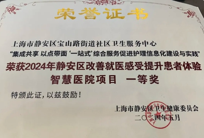 日前,该护理服务项目荣获2024年静安区优秀护理项目——智慧医院项目一等奖。
