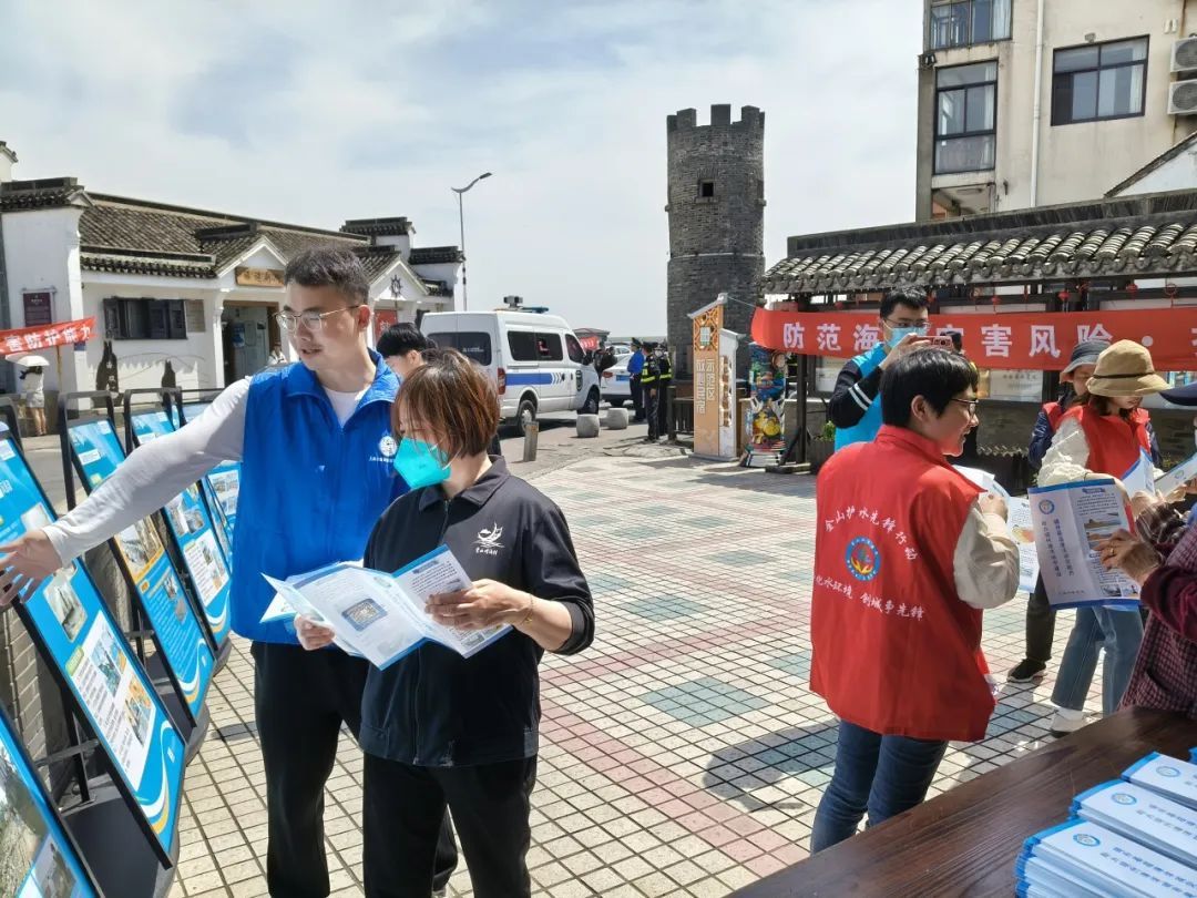 13日下午,海洋事务中心联合金山区海洋局、金山区海洋海塘管理所,走进上海海洋意识教育基地金山嘴渔村,开展了海洋防灾减灾宣传进社区活动。志愿者们通过设置展板、悬挂横幅、发放手册、现场咨询等方式,向周边群众和游客们普及了各种海洋灾害危害及防御措施。