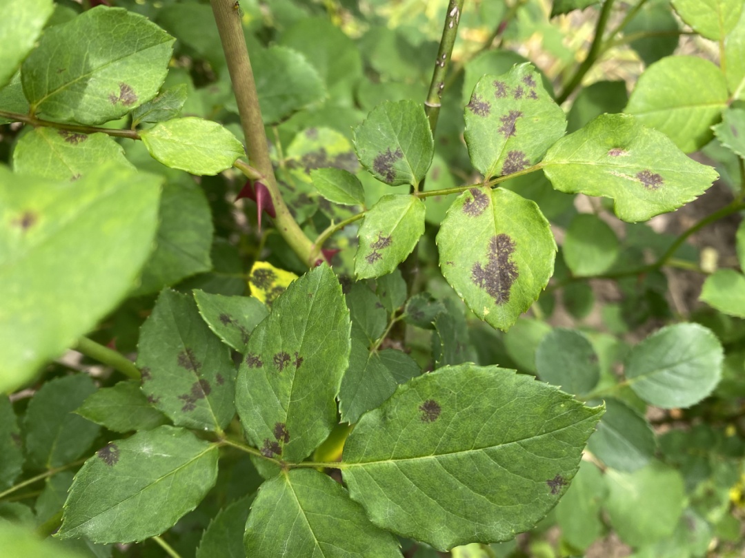 月季黑斑病是生物性病害,主要为害月季、蔷薇等。受害植物叶片初期病斑为褐色小点,后扩大为黑褐色近圆形斑点,严重时除病斑外整张叶片变黄、脱落。