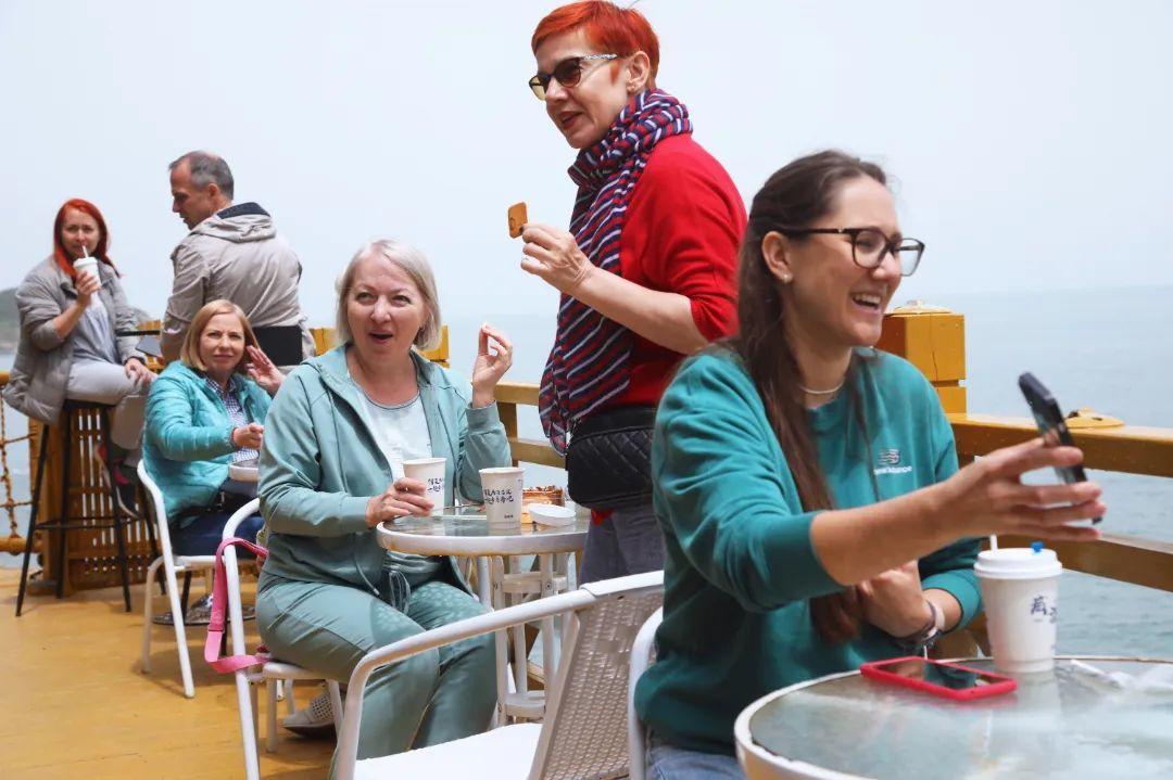 威海的山海景观美不胜收。在华夏城景区,俄罗斯旅行商不仅领略了山水秀美,而且观看了场景剧《城南硝烟》,体验了高空玻璃桥,欣赏了实景演艺《神游传奇》秀;在环海路,俄罗斯旅行商透过车窗畅享千里山海自驾旅游公路的魅力;在崖尚咖啡,大家边品咖啡边欣赏悬崖峭壁及海边巨浪;在幸福公园、威海公园,大家纷纷拿起相机,在幸福门、大相框合影留念;在国际海水浴场,大家沐浴阳光、脚踏沙滩、感受海风拂面;在天沐温泉,大家沐浴在特色功能温泉浴池中,十分惬意……