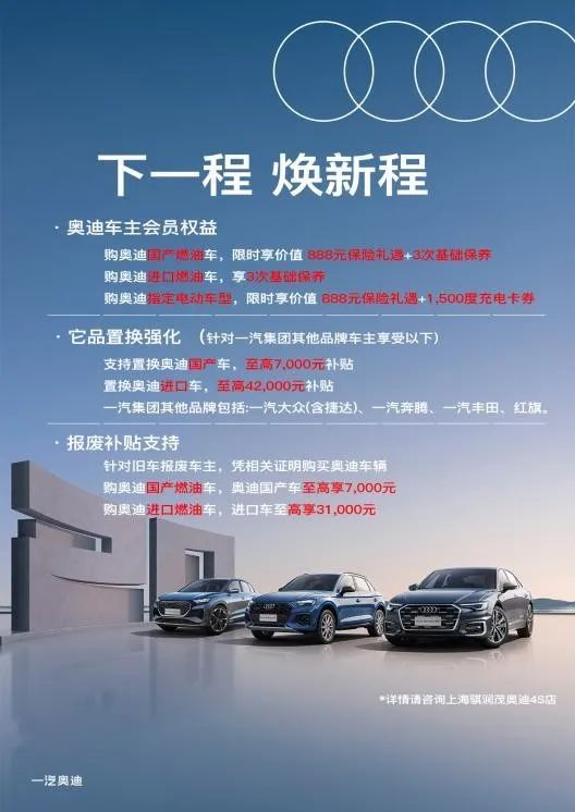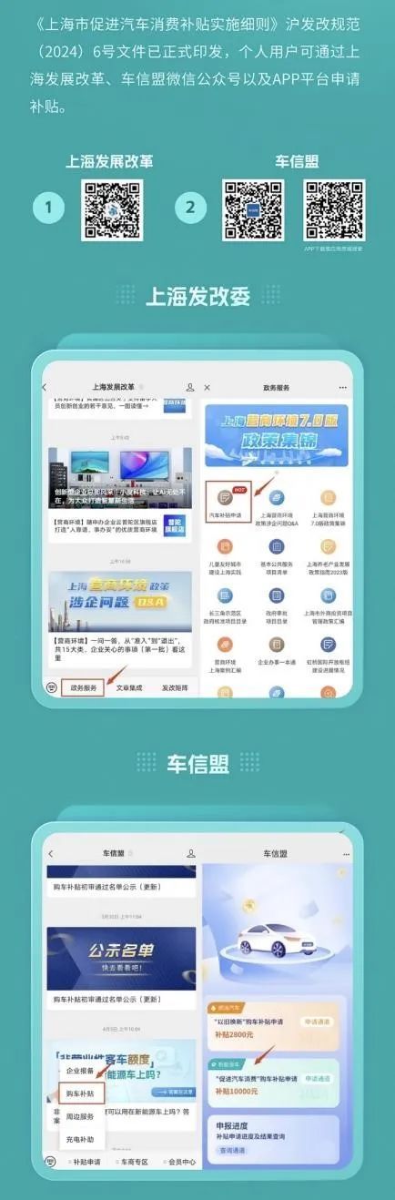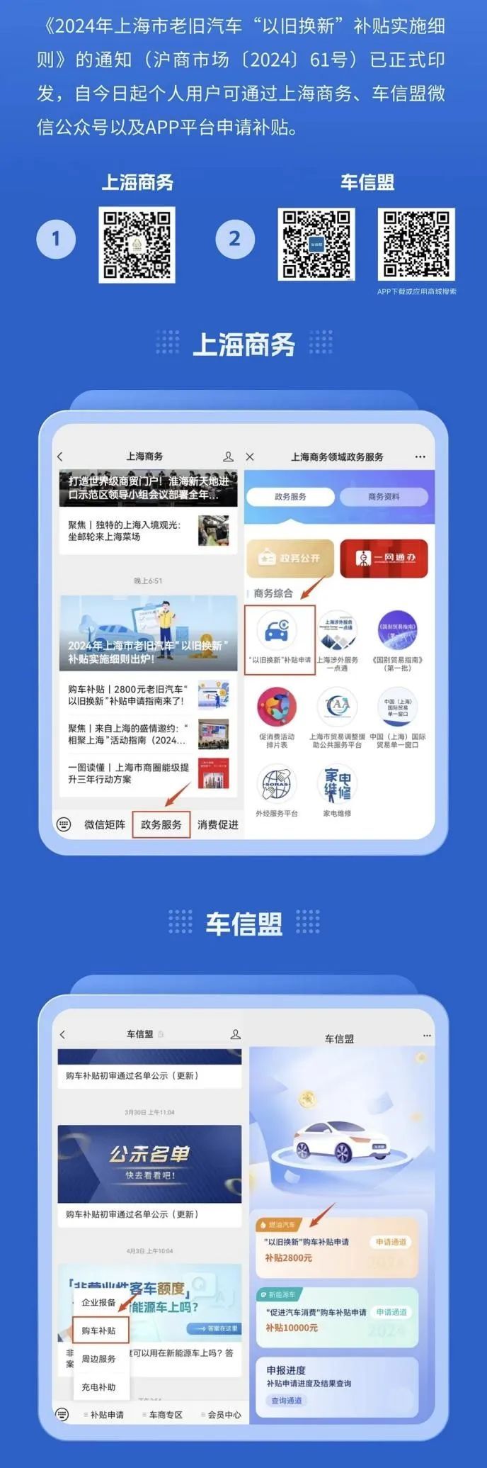 注意!注意!近期换车太划算啦! 上海市政府相关部门联合印发 《上海市促进汽车消费补贴实施细则》和《2024年上海市老旧汽车“以旧换新”补贴实施细则》 区内车企也结合“五五购物节” 纷纷推出系列购车优惠活动 消费者置换新车 最高可享“政策+活动”双重折扣 快来看看如何申请吧! 一 置换电动小客车补贴 01 补贴范围和标准 自2024年1月1日至2024年12月31日(含当日),个人用户购买纯电动小客车新车,注册使用性质为非营运,且在规定期限内报废或者转让(不含变更登记)本人名下在本市注册登记的非营业性小客车的,本市给予个人用户一次性10000元购车补贴。 02 申请时间 实施细则自2024年1月1日起施行。补贴资金申请截止日期为2025年2月28日。 03 申请流程 补贴申请须由个人用户发起。申请人可以通过个人实名账号登录“上海发展改革”等指定平台(见下图),向市发展改革委提出购车补贴申请,签署《补贴申请承诺书》。 04 咨询渠道 补贴细则原文可登录上海市发展与改革委员会官方网址查询:https://fgw.sh.gov.cn/fgw_gfxwj/20240419/1173be186cb84d9c9f41d9c35470d832.html 个人用户如需咨询本实施细则有关内容,或者查询申请办理方式、审核状态及办理结果的,可以通过指定平台查询,或者致电热线电话咨询。 二 置换燃油小客车补贴 01 补贴范围和标准 自2024年1月1日至2024年12月31日(以下日期均含当日),个人用户购买国六b排放标准的燃油小客车新车,注册使用性质为非营运的,且在规定期限内,报废或转让(不含变更登记)本人名下在本市注册登记的国五及以下排放标准非营业性燃油小客车,本市给予个人用户一次性2800元购车补贴。 02 申请时间 实施细则自2024年1月1日起施行。补贴资金申请截止日期为2025年2月28日。 03 申请流程 符合上述条件的个人用户可以通过“上海商务”微信公众号等指定平台(见下图)提交相关信息,向市商务委提出购车补贴申请,签署《补贴申请承诺书》。 04 咨询渠道 补贴细则原文可登录上海市商务委员会官方网址查询: https://sww.sh.gov.cn/zwgkgfqtzcwj/20240409/10e8a49aa1664ea6b273cd93a899815d.html 个人用户如需咨询本细则有关内容,或者查询相关申请办理方式、审核状态及办理结果的,可以通过指定平台查询,或者致电热线电话咨询。 热线电话号码: 400-820-3152 服务时间: 工作日 9:00~11:00 13:00~17:00 三 区内车企优惠活动 01 元通宝马4S店 活动时间: 自2024年5月1日至5月31日 活动内容: ●“5动上海,触手可及”上海元通宝马五一购车季,推出特价礼——30余台特价车促销,最高额外享受30000以上综合优惠; ●“55”专属礼——订购全新5系车型可享赠送价值15800装潢大礼包,终身保养权益; ● 金融礼——指定车型可享24期零利率按揭方案; ● 置换礼——旧车置换可享额外3000-10000元现金补贴; ● 试驾礼——到店试驾可领取精美礼品一份。 02 上海骐润茂汽车销售有限公司 活动时间: 自2024年5月1日至5月31日 活动内容: ● 支持置换奥迪国产车,至高7000元补贴; ● 置换奥迪进口车,至高42000元补贴 活动详细解释以企业为准。