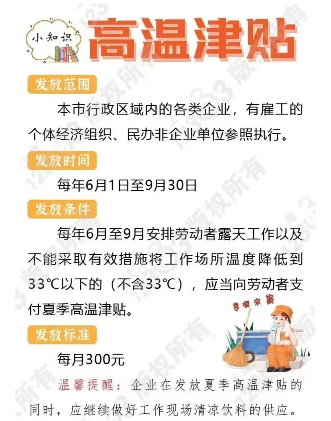 近日,有网民留言 称自己收到了一封题为 “2024年财政个人劳动补贴 领取通知”的邮件 邮件称,“补贴政策仅限于1年内工资扣税满3个月以上的中国公民,收到通知后,请及时进行申请登记,逾期视为弃权领取”,要求使用微信扫描所附二维码,进入“国家人力资源和社会保障官方小程序”办理。 这是真的吗? 明确告诉大家 这是假的!千万别信! 人力资源社会保障部 从未发放过所谓的“个人劳动补贴” 上述邮件为不实信息 且涉嫌诈骗 不法分子利用非法途径,获取网民邮箱账号或手机号、微信号等,随后发送虚假信息,诱导群众扫描二维码或点击链接,进入精心伪造的“官方”小程序或网站,并填写身份证、银行卡、验证码等个人信息,以达到骗取钱财的目的。 提醒大家: 人力资源社会保障部门发布的通知不会让您提供银行卡、密码、手机验证码等个人信息。 收到类似“扫描二维码或点击网站链接领取补贴”的信息或邮件,一定要提高警惕,切勿随意在陌生网站上填写身份证号、银行卡号、银行卡余额等个人信息,防止造成财产损失。 如不慎遭遇网络诈骗,保存好聊天记录、交易记录等相关证据材料,立即拨打110报警求助。 “2024年个人劳动补贴”是假的! 但有一笔钱 真的马上要到账了! 随着温度越来越高 下个月起 大家可以领夏季高温津贴啦~ 连发4个月的那种! 在上海 高温津贴的发放标准为 每月300元 发放时间为每年6月至9月 △ 图片来源:上海人社 关于高温津贴的那些事 什么是高温津贴? 根据《防暑降温措施管理办法》规定,劳动者从事高温作业的,依法享受岗位津贴。 用人单位安排劳动者在35℃以上(包括35℃)高温天气从事室外露天作业以及不能采取有效措施将工作场所温度降低到33℃以下(不包括33℃)的,应当向劳动者发放高温津贴,并纳入工资总额。 哪些人可以领高温津贴? 只要用人单位安排了高温作业,企业、事业单位和个体经济组织等单位的劳动者都可依法享受高温津贴。 注意,饮料不能充抵高温津贴! 用人单位应当为高温作业、高温天气作业的劳动者供给足够的、符合卫生标准的防暑降温饮料及必需的药品。 不得以发放钱物替代提供防暑降温饮料。防暑降温饮料不得充抵高温津贴。此外,如果最高气温超过了40℃应该停止室外露天工作,并且不能扣减工资。同时,用人单位不得安排怀孕女职工和未成年工在35℃以上的高温天气从事露天作业及在温度超过33℃以上的工作场所作业。 高温津贴是国家规定的津补贴项目,不是单位福利。高温津贴的性质属于工资。支付高温津贴是用人单位的法定义务。 如果用人单位在发放高温津贴上违规,有关部门会要求用人单位及时改正。 高温津贴如何发? 1.用人单位选择按月发放高温津贴的 高温津贴发放时间:6月、7月、8月、9月(共4个月) 从事室外作业和高温作业的劳动者高温津贴标准每人每月不低于300元;室内非高温作业的劳动者每人每月不低于200元(各个城市有所不同,具体以当地为准)。 2.用人单位选择按照劳动者实际从事高温作业的天数计发高温津贴的 全年当中凡安排劳动者在35℃以上高温天气从事室外露天作业以及不能采取有效措施将工作场所温度降低到33℃以下的,应当按照每人每天不低于20元的标准向劳动者发放高温津贴。其中,非全日制用工的,用人单位应当按照每人每小时不低于3元的标准向劳动者发放高温津贴。 3.用人单位应通过内部民主决策程序,自主选择高温津贴计发方式并确定具体标准 其中,企业可以通过与职工开展集体协商签订集体合同或将高温津贴制度提交职工(代表)大会讨论通过等民主程序确定高温津贴计发方式和具体标准。 单位不发高温津贴怎么办? 如果用人单位在发放高温津贴上违规,劳动者可以向工会寻求帮助,工会组织有权要求用人单位及时改正。 此外,劳动者还可以向社保、安监等部门举报,由相关部门采取责令用人单位整改、行政处罚等措施,依法维护自身合法权益。 发高温津贴后能降低工资? 最低工资标准并不包含高温津贴,因此,不得因发放高温津贴而降低劳动者工资。 因高温停止作业,扣工资? 《防暑降温措施管理办法》明确规定,因高温天气停止工作、缩短工作时间的,用人单位不得扣除或降低劳动者工资。 资料:新闻坊 编辑 | 陈薇婷 责编 | 潘婷 陈薇婷