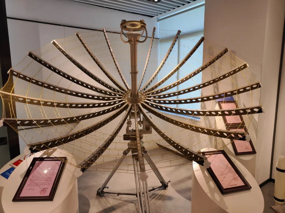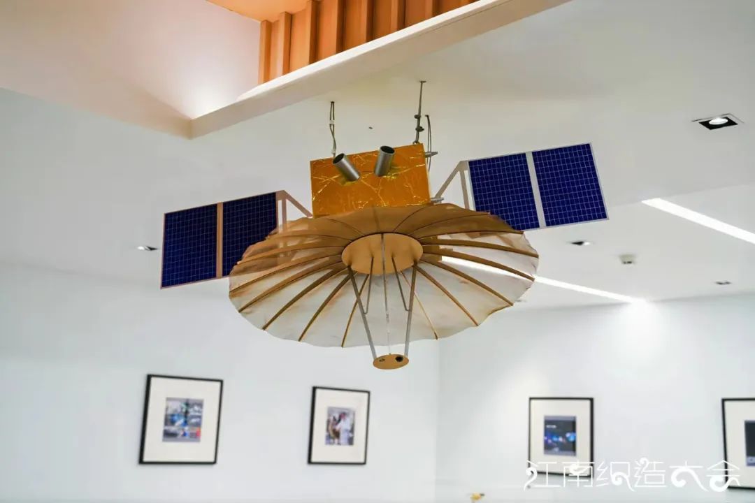 在江南织造大会的展览中,第一件展品就是一把金色的“伞网”。它可不是普通的雨伞,而是地球与月球的通信接收器,也叫星载大型可展开天线,曾用于“北斗”导航、“天通”“鹊桥”中继卫星等高性能卫星的“星载天线金属网”。