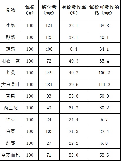 上表罗列了一些食物的可吸收钙,可与牛奶作比较。需要注意的是,以上数据是基于100克食物获得的钙量。计算时,应根据这些食物的每日实际摄入量来换算,如牛奶每日摄入量为200-300毫升,其中的钙含量为242-363毫克,可吸收钙77.6-116.4毫克。
