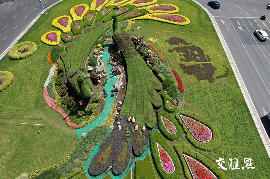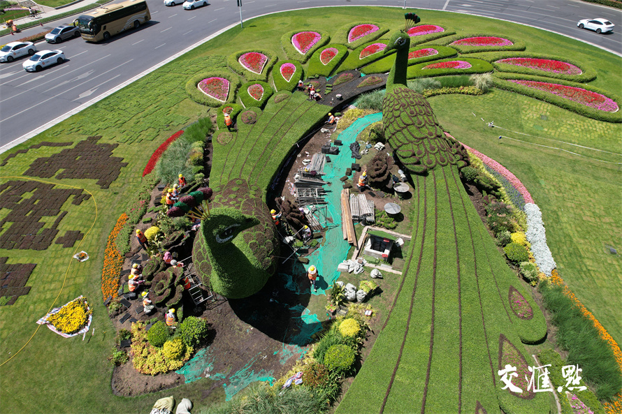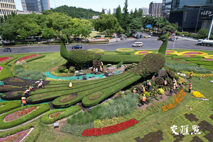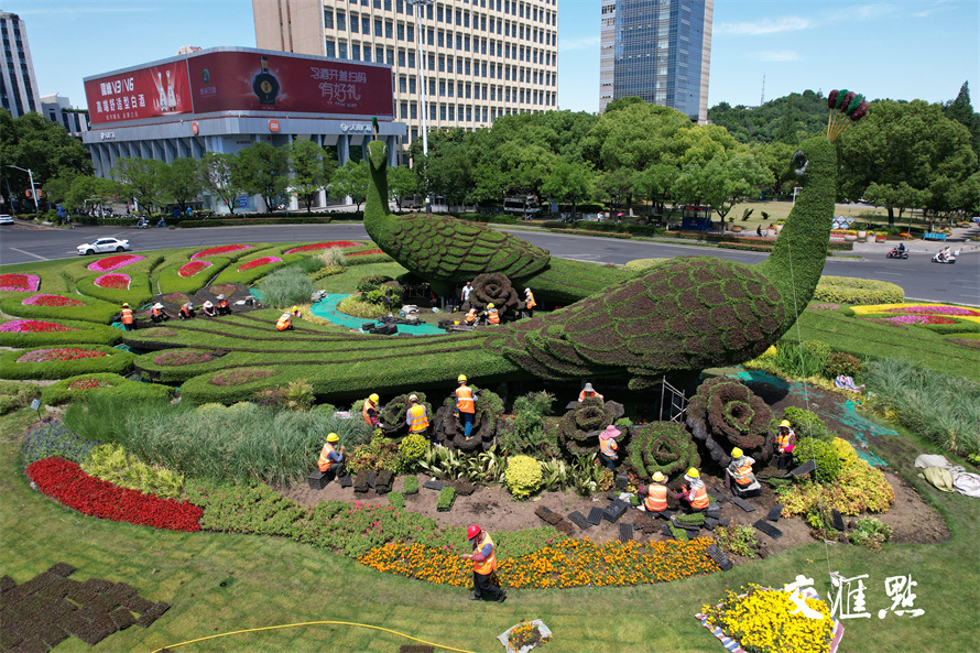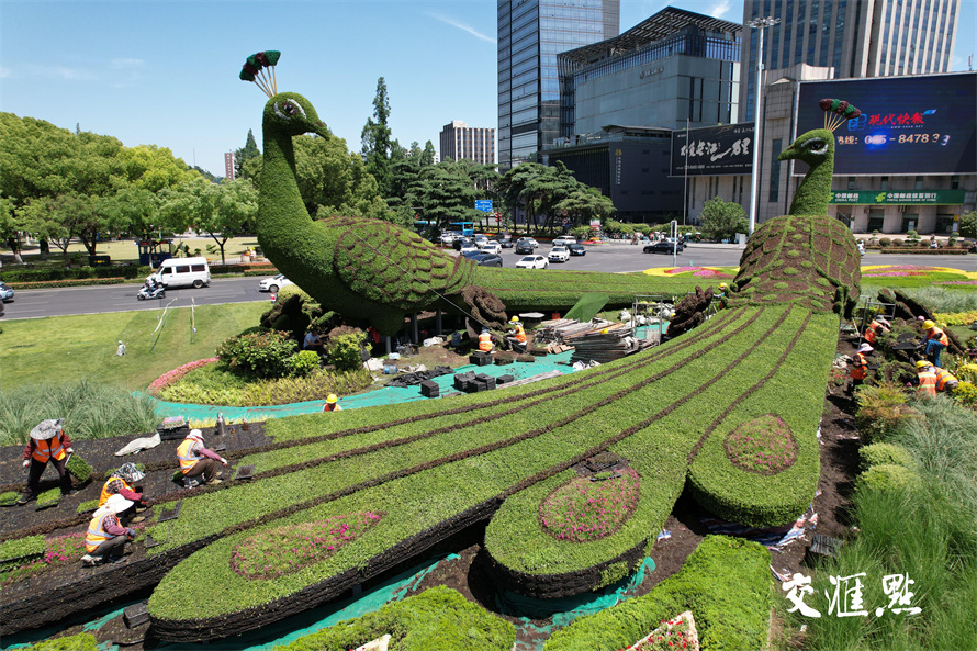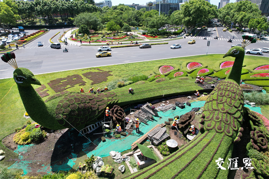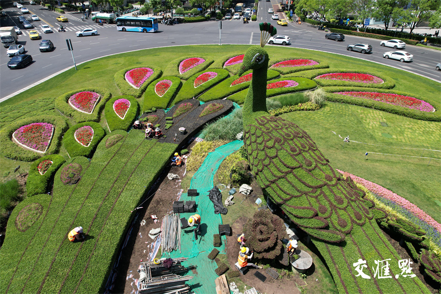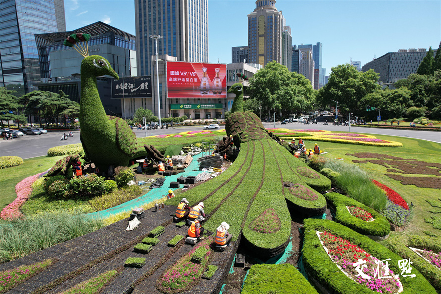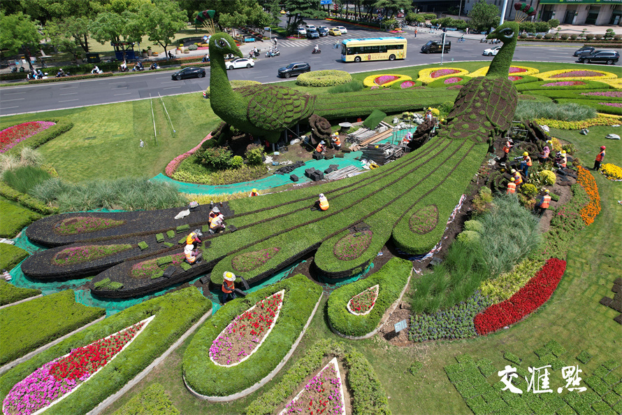 2024年5月16日,南京鼓楼广场,园林工人正在给孔雀绿雕换下耐寒植物佛甲草和红景天,换上美丽的“夏装”五色草。五色草又称锦绣苋,在夏季高温天中仍然生长良好。 新华日报 交汇点记者 宋宁 摄