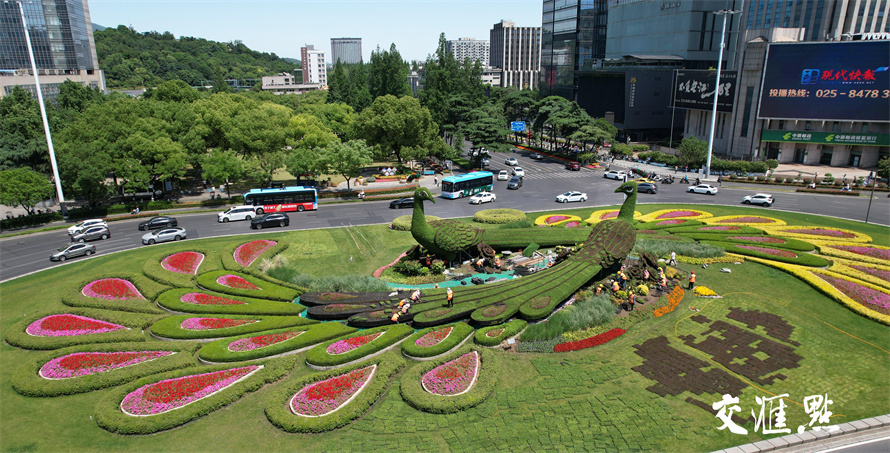 南京鼓楼广场孔雀绿雕换“夏装”