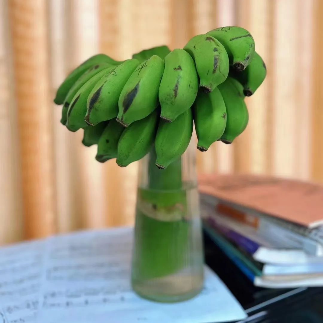家住松江的小媛最近给自己的办公桌上添了一件“新宠”——一串带着茎杆的绿香蕉。“将茎秆放入花瓶,算是简单的水培,也就换换水,不用怎么管它,放一阵香蕉就会慢慢变黄,也能食用。”小媛说。