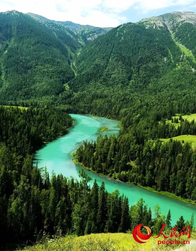 卧龙湾位于新疆阿勒泰喀纳斯景区,因河湾中有一酷似龙形的河心洲而得名。图为喀纳斯景区卧龙湾。人民网记者 韩婷 摄