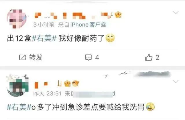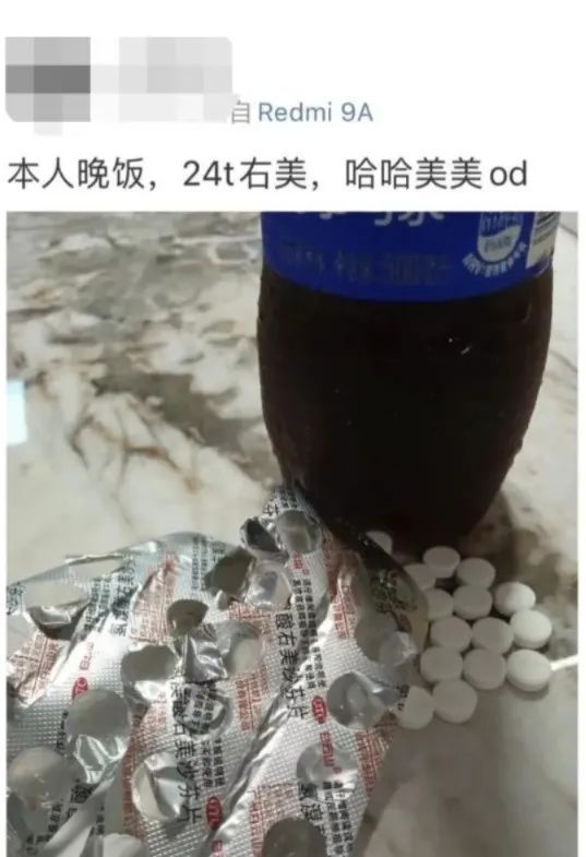 在社交平台上,依然可以看到不少年轻人对于右美沙芬的讨论和追捧。在微博“#右美#”话题中,就有多名年轻网友分享自己嗑药右美沙芬的经历,“o多了(超量嗑药)冲到急诊室,医生差点给我洗胃”“30t(30片)半小时了都没感觉”“昨天怒o20t(嗑药20片),昏天暗地分不清现实和梦,不知道自己在哪”。