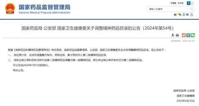 5月7日,国家药监局官网显示,国家药监局、公安部、国家卫健委联合发布关于调整精神药品目录的公告,将右美沙芬、含地芬诺酯复方制剂、纳呋拉啡、氯卡色林列入第二类精神药品目录。公告自2024年7月1日起施行。