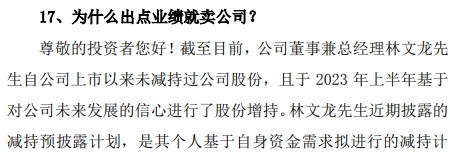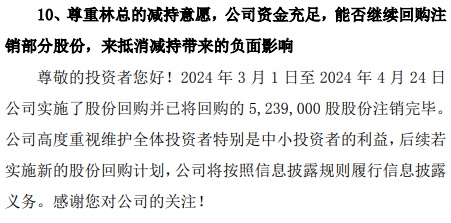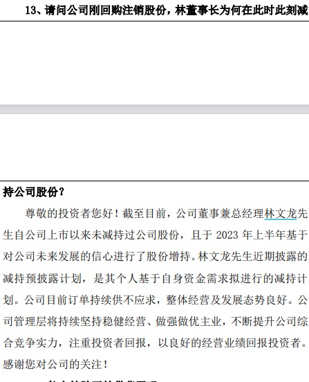 如有投资者提问:“请问公司刚回购注销股份,林董事长(应为总经理,公司董事长为秦龙——记者备注)为何在此时此刻减持公司股份?”也有投资者表示尊重林文龙的减持意愿,但公司目前资金充足,“能否继续回购注销部分股份,来抵消减持带来的负面影响?”
