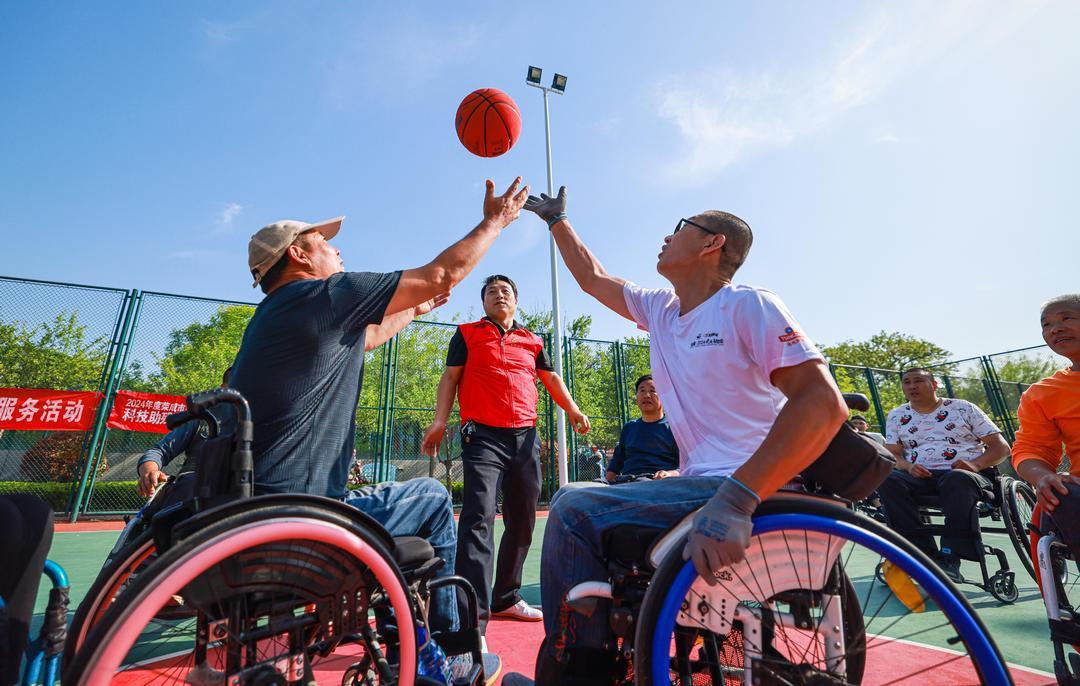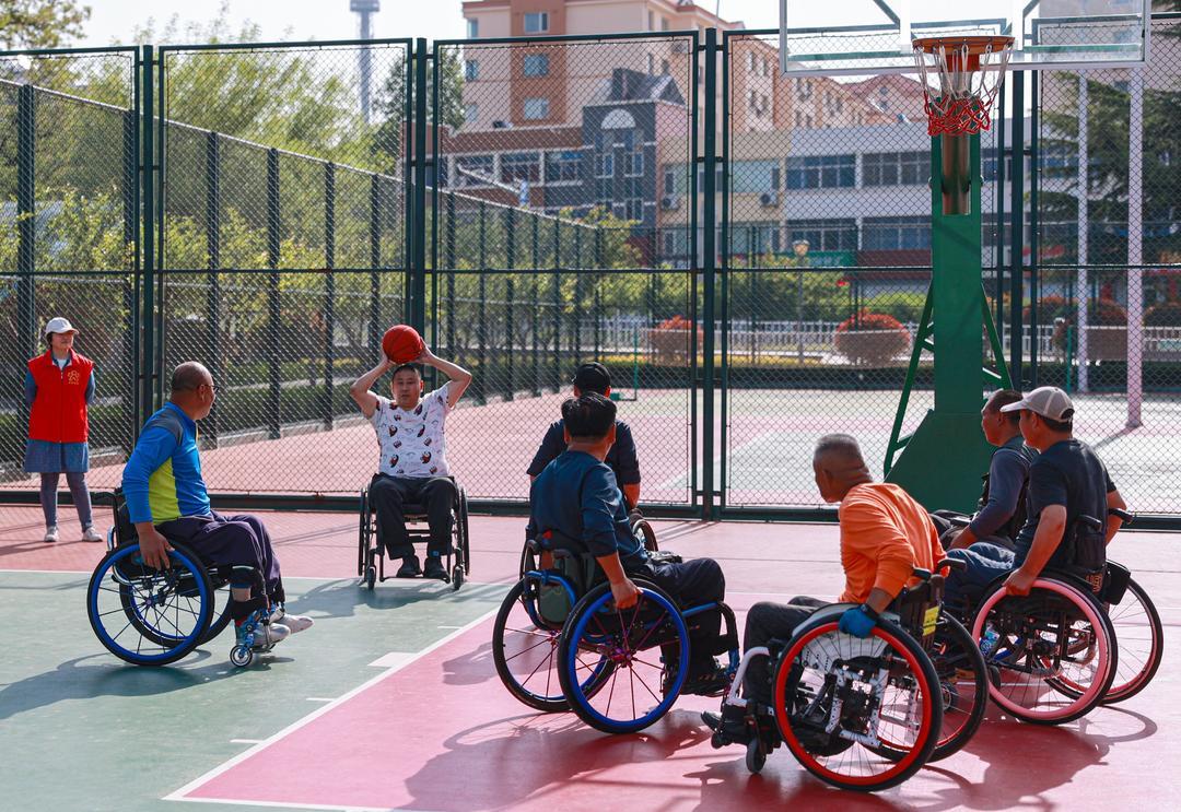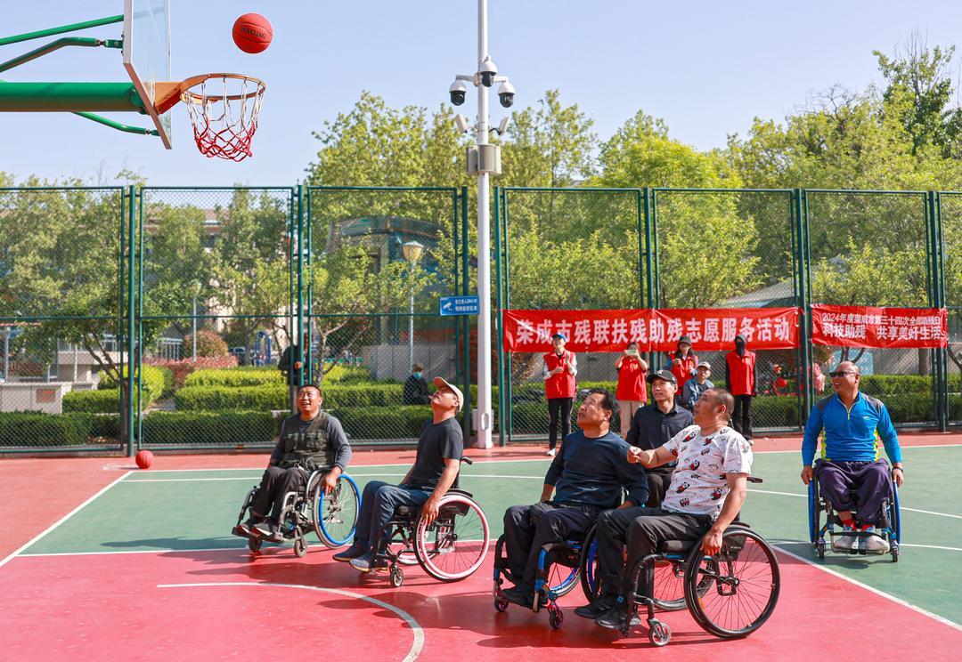 5月17日,在荣成市新世纪广场篮球场,荣成市残联组织志愿者陪伴残友们举行轮椅篮球赛。近期,为迎接5月19日的第34次全国助残日,当地残联与志愿服务组织开展形式多样的助残志愿服务活动。