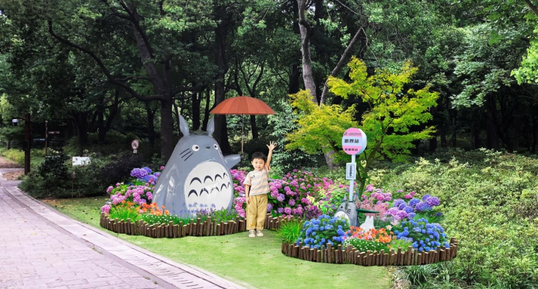 站在宫崎骏异想世界的车站站台,巨大的龙猫用它胖乎乎的小手撑起一把雨伞,为小朋友们遮挡烈日, 两只迷你的龙猫在指示牌下静静伫立,仿佛同小朋友一起在等待 电车到来。蓝紫色的绣球花包围着宫崎骏《龙猫》中的电影画面, 带你短暂脱离现实,进入一个温暖又充满想象的世界。