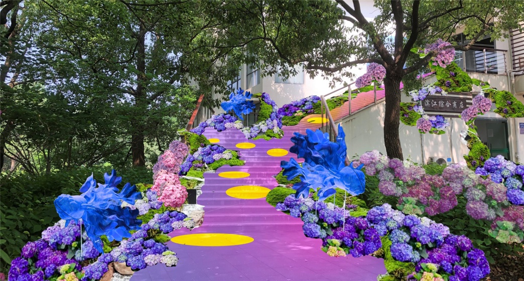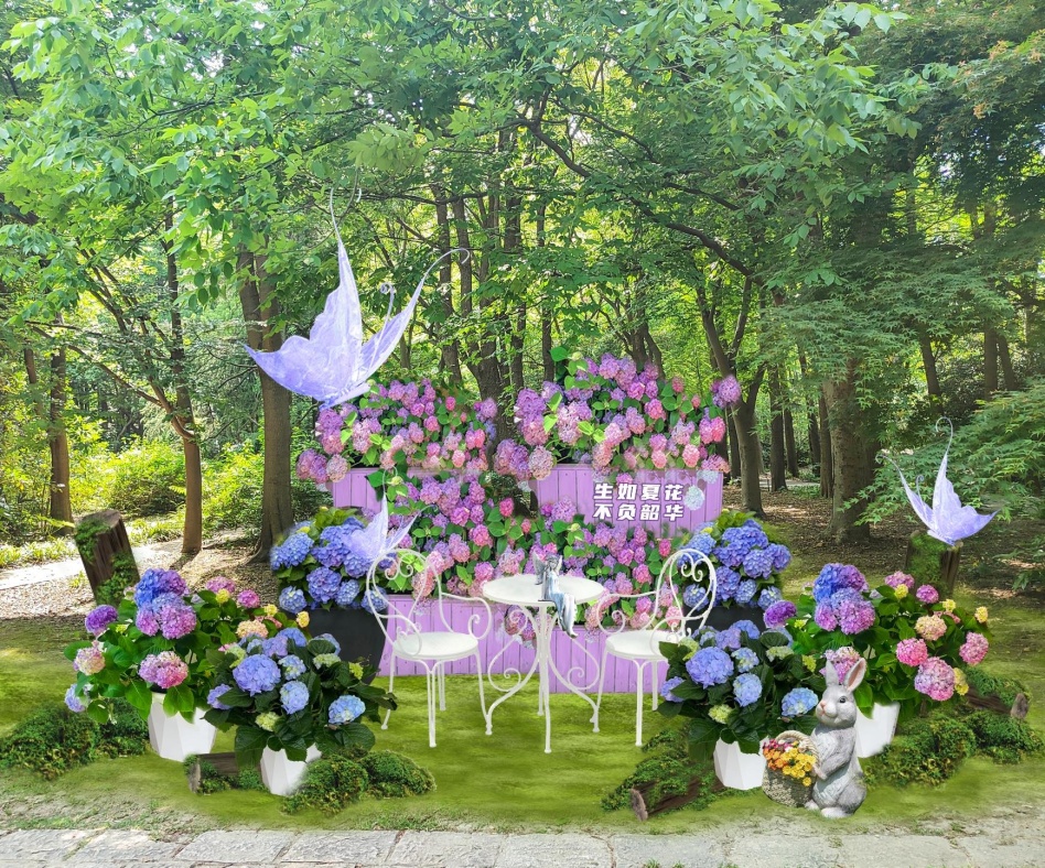 景点以八仙花为核心元素,围绕坐凳搭配八仙花,这些花在夏日阳光下竞相绽放,形成一片色彩斑斓的花海。为了增添景点的生动性和趣味性,在花海中放置了蝴蝶装置,栩栩如生,仿佛在花丛中翩翩起舞。营造出一个既富有层次感又充满生机的花海空间。