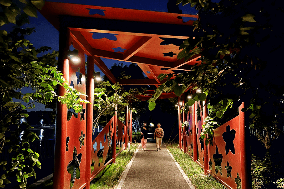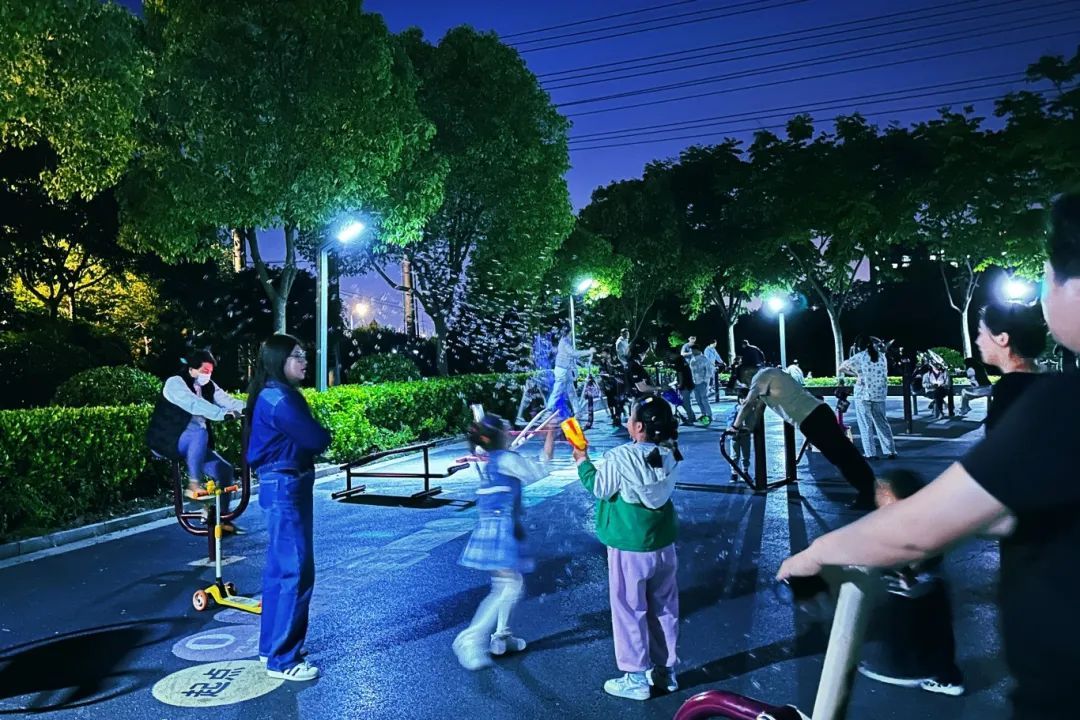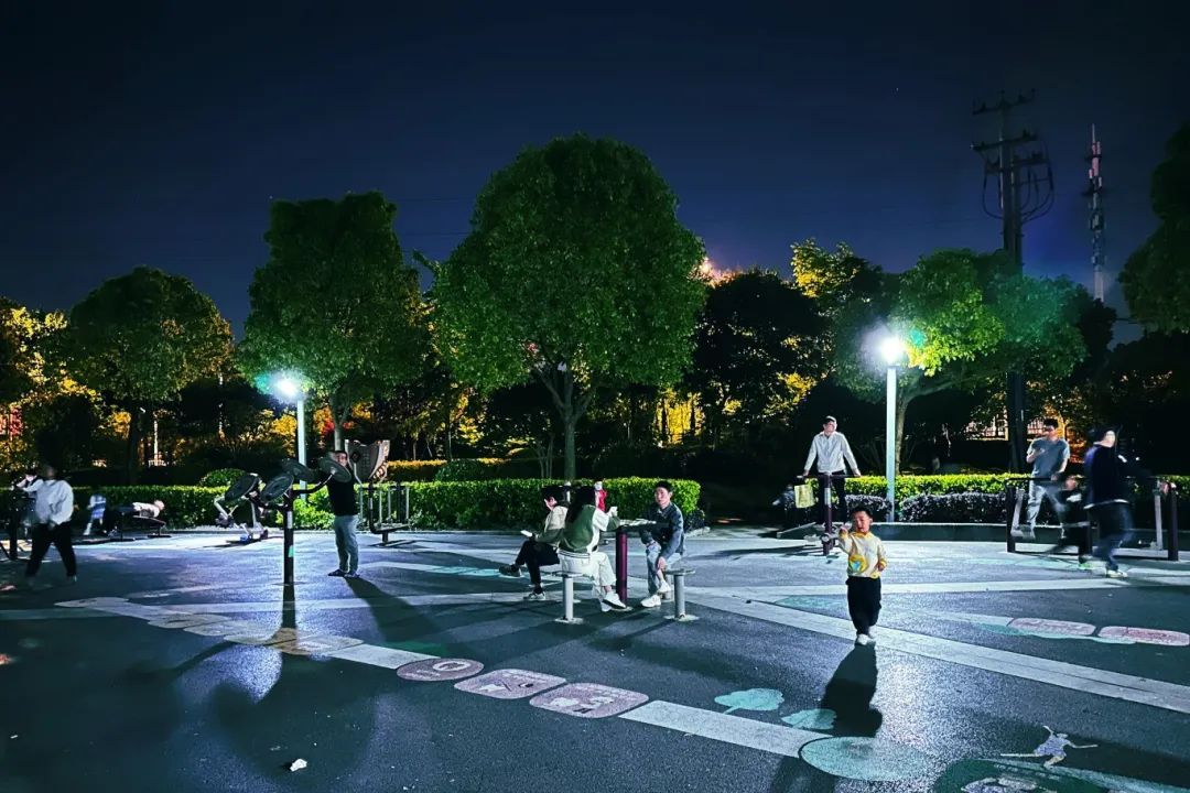 沿岸的健身活动区是锻炼身体的好去处,多元化的功能器材一应俱全,更是爸妈们的遛娃圣地。