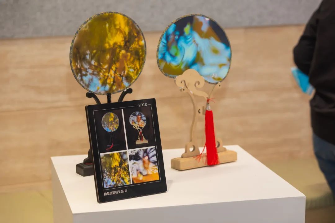 值得一提的是,这些制作精美、融入设计巧思的旗袍和盘扣文创均由上海闵行职业技术学院创意设计系服装与服饰设计专业盘扣工作室参与设计制作。其中,盘扣文创是以马桥文化元素为主题,以盘扣工艺为载体,结合马桥文化出土的陶器形态及纹样图案为基础创新设计研发的,不仅体现了具象美与抽象元素的结合,更将传统制作工艺与现代时尚巧妙融合,焕发马桥文化时代魅力。此外,在互动展区,陈列着马桥文化抽象摄影文创产品,包括口罩、丝巾、团扇等,令现场观众眼前一亮。