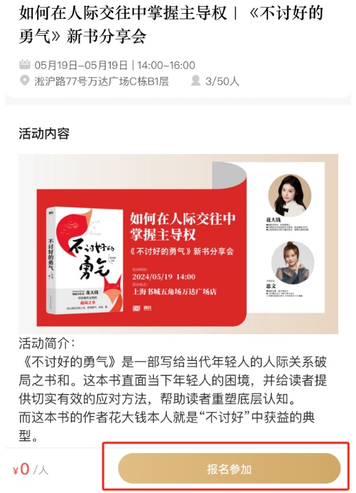 上海书城小程序在线预约注册。登录“上海书城”小程序,在“活动”页面中找到想要报名的活动,点击“报名参加”,填写联系信息确认后即可。