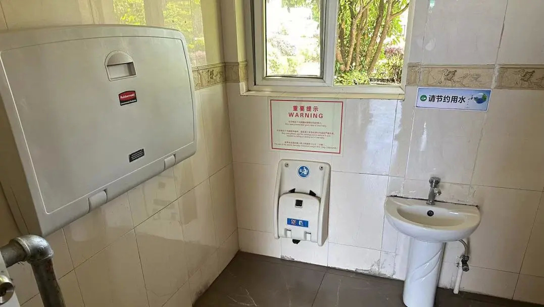 农贸市场公厕第三卫生间内新增了母婴板、幼儿坐便器、幼儿洗手台,公厕提供免洗洗手液和厕纸,如厕环境得到了改善。