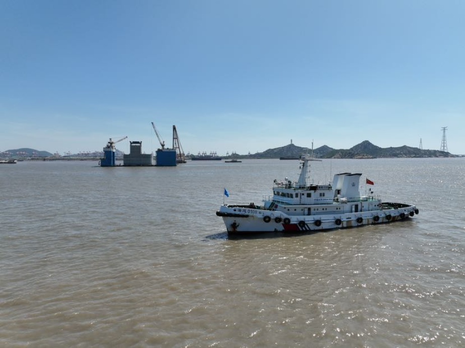 据海事部门介绍,施工水域处于开放海域,水文气象条件较差,桶式基础结构拖带、下沉过程中受到横流影响,容易发生偏移、倾斜,拖带作业风险高,施工难度大,对安全监管提出了更高的要求。自该项目开工以来,洋山港海事局持续加强现场监管和服务保障,通过船舶交通管理中心远程监控与海事巡逻艇现场护航相结合,做到全天候、全时段、全方位的安全监管,多次组织召开施工安全保障协调会,实施船舶检查并督促整改安全缺陷,派员定期走访项目部开展安全知识讲座和现场应急演练,持续深化与涉水单位的信息互通、执法联动、资源共享。