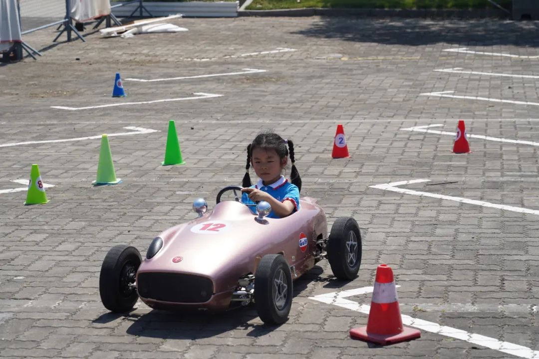 这边男孩子们激战正酣,另一边的复古赛车体验区,女孩子们同样乐在其中。在长约50米的迷你赛道上,小朋友们驾驶着形状各异、速度适中的儿童赛车,享受驾驶的乐趣。