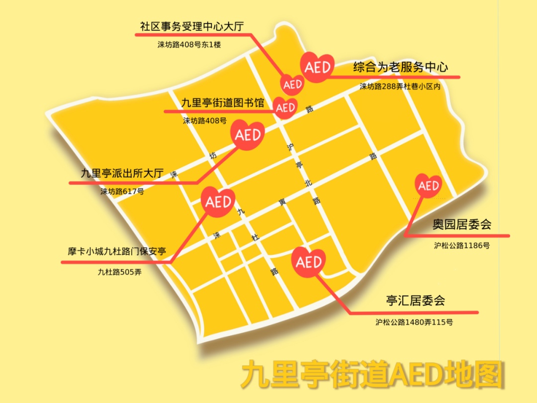 据介绍,九里亭社区基金会于2023年底启动了社区应急救护普及项目。该项目在九里亭街道部分重要场所、人员密集场所增设多台自动体外除颤器(简称AED)。截至目前,街道公共场所范围内已有7台AED设备,分别位于九里亭街道图书馆、街道社区事务受理中心大厅、九里亭派出所大厅、综合为老服务中心、摩卡小城九杜路门保安亭、亭汇居委会、奥园居委会内。同时,九里亭社区基金会也发布了特别制作的九里亭街道AED地图,供居民参考。