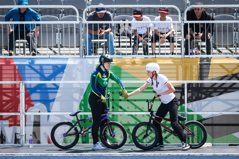 5月17日,奥运会资格系列赛·上海进行第二个比赛日。这是自由式小轮车女子公园赛预赛中选手之间握手鼓励。