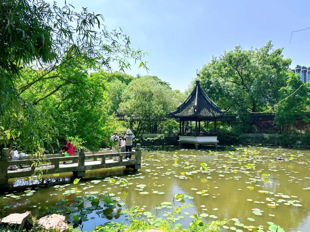 上午9点半,记者在上海五大古典园林之一的醉白池公园看到,已经有不少游客特意赶来享受一年一度的门票半价福利。春夏之交,绿肥红瘦的园林景致正适合观赏,放眼望去,树荫成片,或墨绿,或青绿,在蓝天白云的映衬下,恰似一幅幅唯美的画卷。园内石榴花、睡莲等竞相开放,在郁郁葱葱的绿叶中点缀上一抹抹亮色,引得游客们不禁驻足、拍照。
