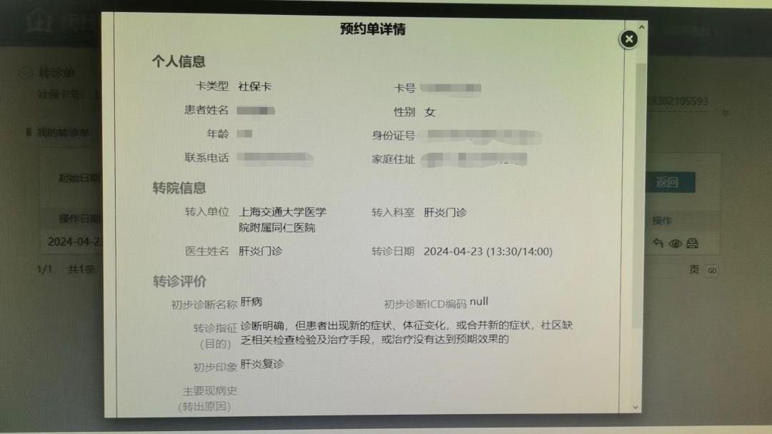 家住七宝74岁的周阿姨也体验了一次专家号下沉社区的“新福利”。4月23日,她因长期肝炎及小三阳病史导致乏力症状前往七宝社区卫生服务中心就诊,家庭医生张彩丽发现肝功能指标异常升高,建议前往上级医院治疗。通过转诊平台,正好同仁医院有号源,张彩丽便帮她预约了当天下午肝炎普通门诊。