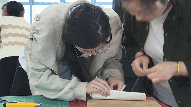 5月18日,奉贤博物馆的文物保护与修复中心用一场沉浸式体验线装书装订的活动,让普通市民瞬间化身“修复师”,近距离接触古籍修复技艺,感受“非遗”魅力。 18日上午,十多位爱书的大朋友小朋友来到奉贤博物馆文物保护与修复中心,在老师手把手的指导下,体验线装书装订修复工作,走进这项了不起的中国传统技艺中,过一把当古籍修复师的瘾。 齐栏、裁剪、打眼、穿纸钉、上皮、订线……一本线装书的制作需经十余道传统工序。大家围在老师身边,聚精会神地琢磨着每一步是怎样完成的,从纸张的裁剪、纸捻钉的制作到如何用线装订,每一步都暗藏玄机。“原来穿针打孔的位置很有讲究,要先分成十等份,而且间距都有特定的比例。”“纸张得人工一张张去对齐,真的觉得很不容易,需要高度的专注力。” 线装书的制作是一门精细的手工活,体验者们进度不一,但都全神贯注、热情高涨,有条不紊地按着老师传授的要点依次操作,在线装书装帧成册的挑战中过五关斩六将。经过整整两个小时,平整的书脚、紧实的缝线,一本本装订整齐的手工线装书终于完成。 大家完成后的喜悦溢于言表。“内心非常自豪!很骄傲!”一位小朋友激动地说,“可以拿到班级里,去向同学们炫耀一下。”不少体验者是奉贤博物馆的老朋友了,他们表示,平时比较关注传统文化,经常来参加博物馆的各项活动,这次活动体验了线装书制作的完整过程,在获得成就感的同时,也感受到了这门技艺是具有科学性的一种艺术。