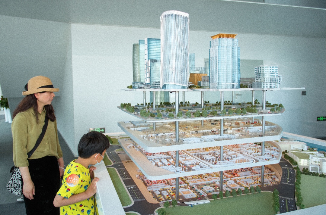在位于西岸智塔东塔楼45楼的AI WINDOW(徐汇滨江规划展示中心),市民游客登高俯瞰黄浦江景和徐汇滨江的城市形态、功能布局,通过生动的区域形象影片、沙盘和“一港一谷一城一心”产业组团模型,了解“工业锈带”蜕变为“生活秀带”“科创绣带”的更新发展历程,共同展望世界级滨水区更美好的未来。