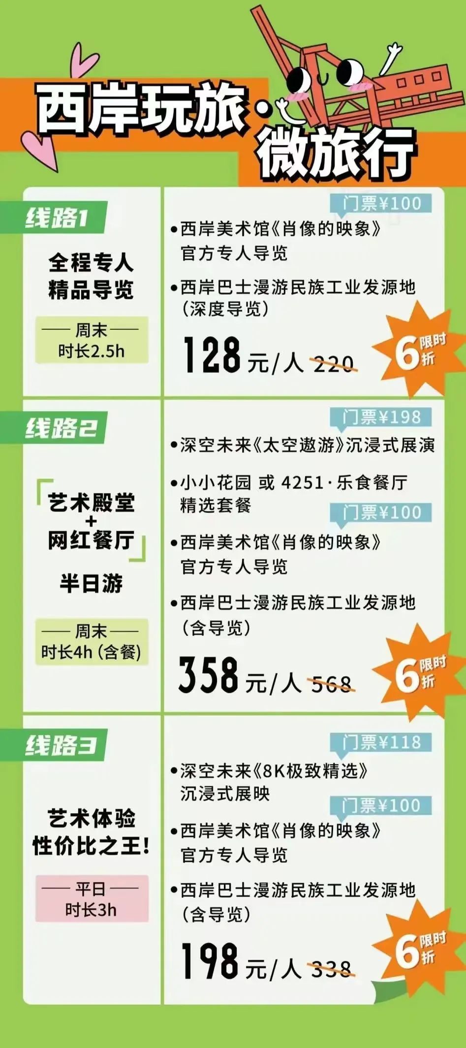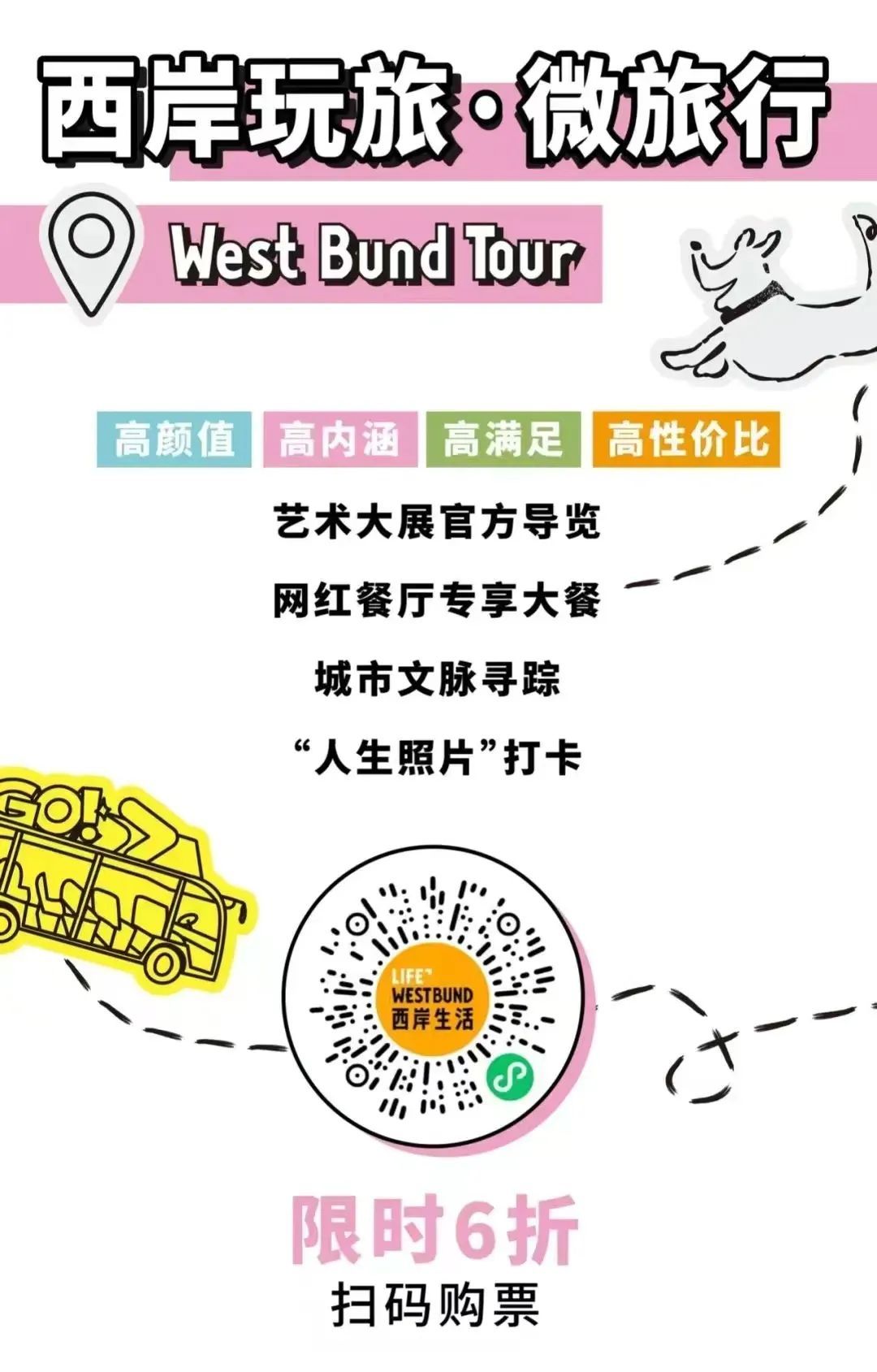 5月推出的“西岸玩旅·微旅行”也在本次公众开放日为市民游客带来了全新的滨水出行体验。作为Citywalk的“升级版”,“西岸玩旅·微旅行”有三条线路,时长从2.5小时到4小时不等,全程配备专人导览,带领市民游客乘上网红小黄车“西岸巴士”,深度漫游徐汇滨江超15处热门目的地。