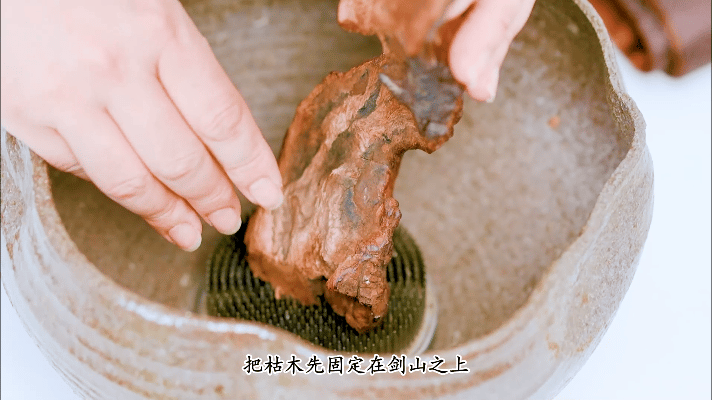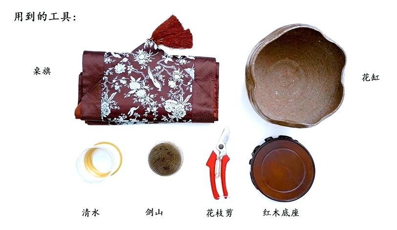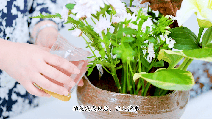 插花完成以后,注入清水。插花作品中,以花器比拟大地和精舍,插制上去的花材,就好似自然地生长出来。