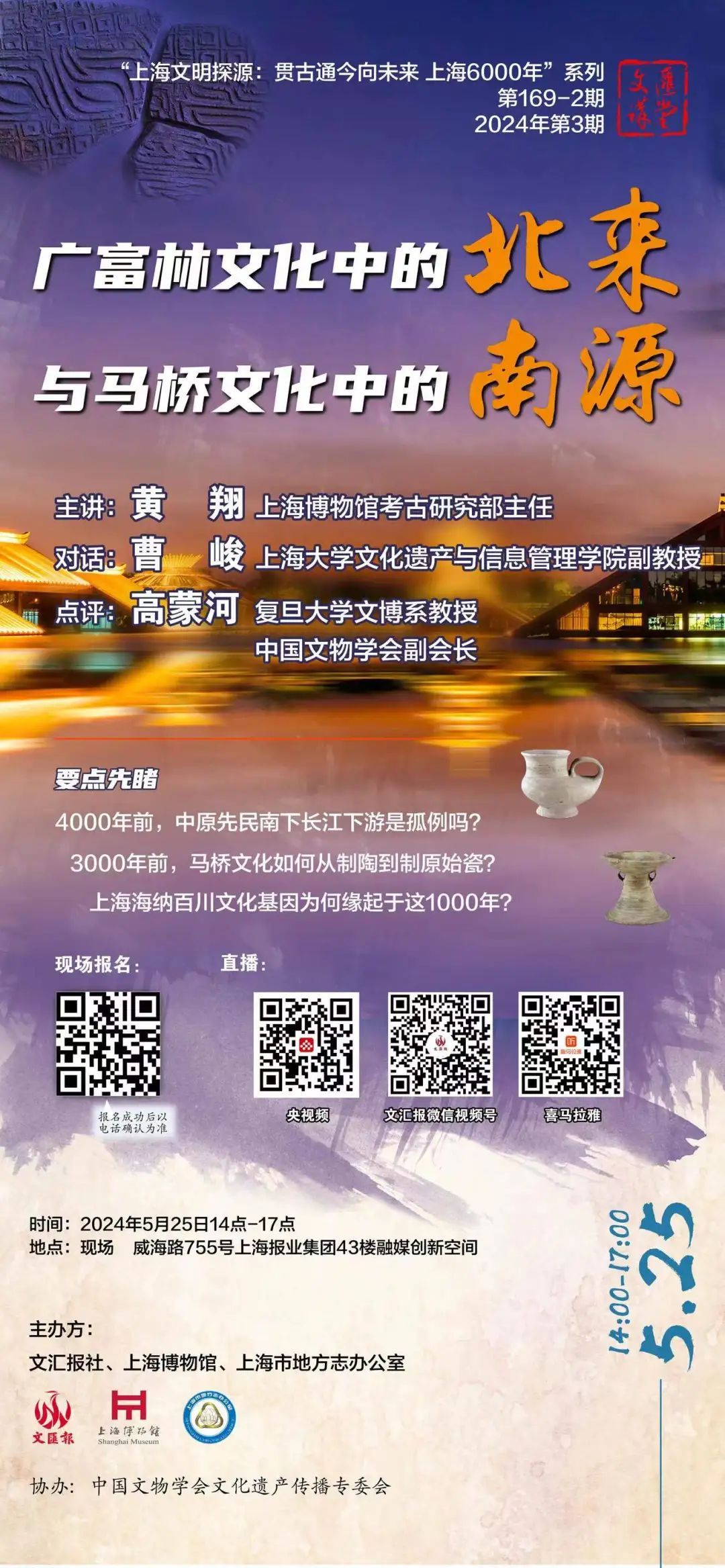 5月25日14:00,由文汇报社、上海博物馆、上海地方志办公室联合主办的“上海6000年”将举办第二讲《广富林文化中的北来与马桥文化中的南源》,考古专家们将以实证讲述,距今5300年至4300年的良渚文明之后的广富林文化、马桥文化中,了解先民们怎样与自然协同发展、南北如何交融并在地化创新,最终如何融入中华文明的多元一体。