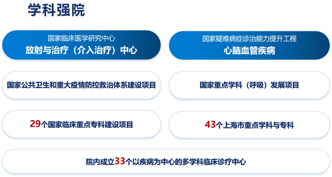 医院在心脏、肝脏、肾脏、肺脏、消化道、泛血管等领域的临床能力处于国内顶尖、世界先进水平。医院以优势学科辐射带动多个高质量的特色学科群协同并进,拥有1个国家疑难病症诊治能力提升工程——心脑血管疾病,4个国家重大疾病多学科合作诊疗能力建设项目——消化道肿瘤、心脏瓣膜病、重症肺炎、早期认知障碍疾病,有国家公共卫生和重大疫情防控救治体系建设项目,国家重点学科(呼吸)发展项目。医院有国家临床重点专科建设项目29个,上海市重点学科与专科43个,院内成立了33个以疾病为中心的多学科临床诊疗中心。